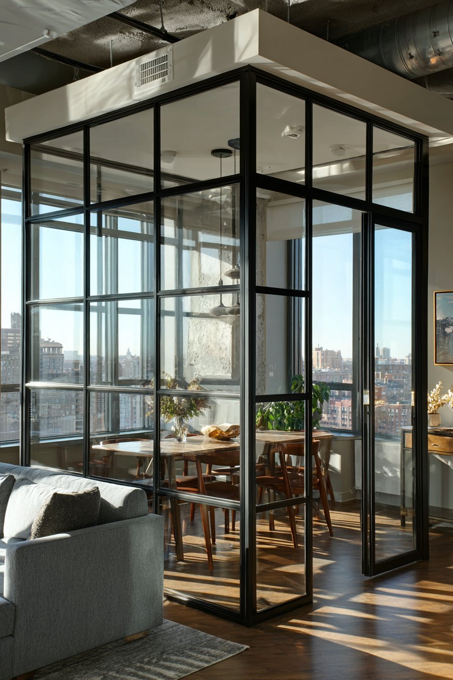 Key Design Tips: Choose high-quality powder-coated steel for durability and consistent finish. Ensure glass panels are tempered safety glass for household use. Consider the partition’s proportions carefully—too dense and it blocks too much light, too sparse and it loses its defining presence. Install proper anchoring to ceiling and floor for stability. Coordinate the metal finish with other hardware in the space for cohesion. Position the partition to maximize natural light flow while still creating meaningful separation. Consider incorporating adjustable panels if flexibility is desired. Maintain clean lines in surrounding furniture to complement the geometric aesthetic.