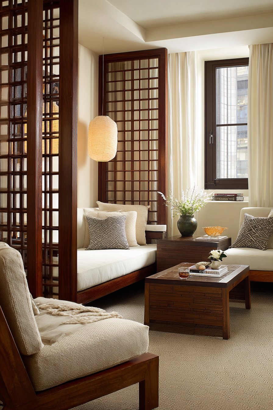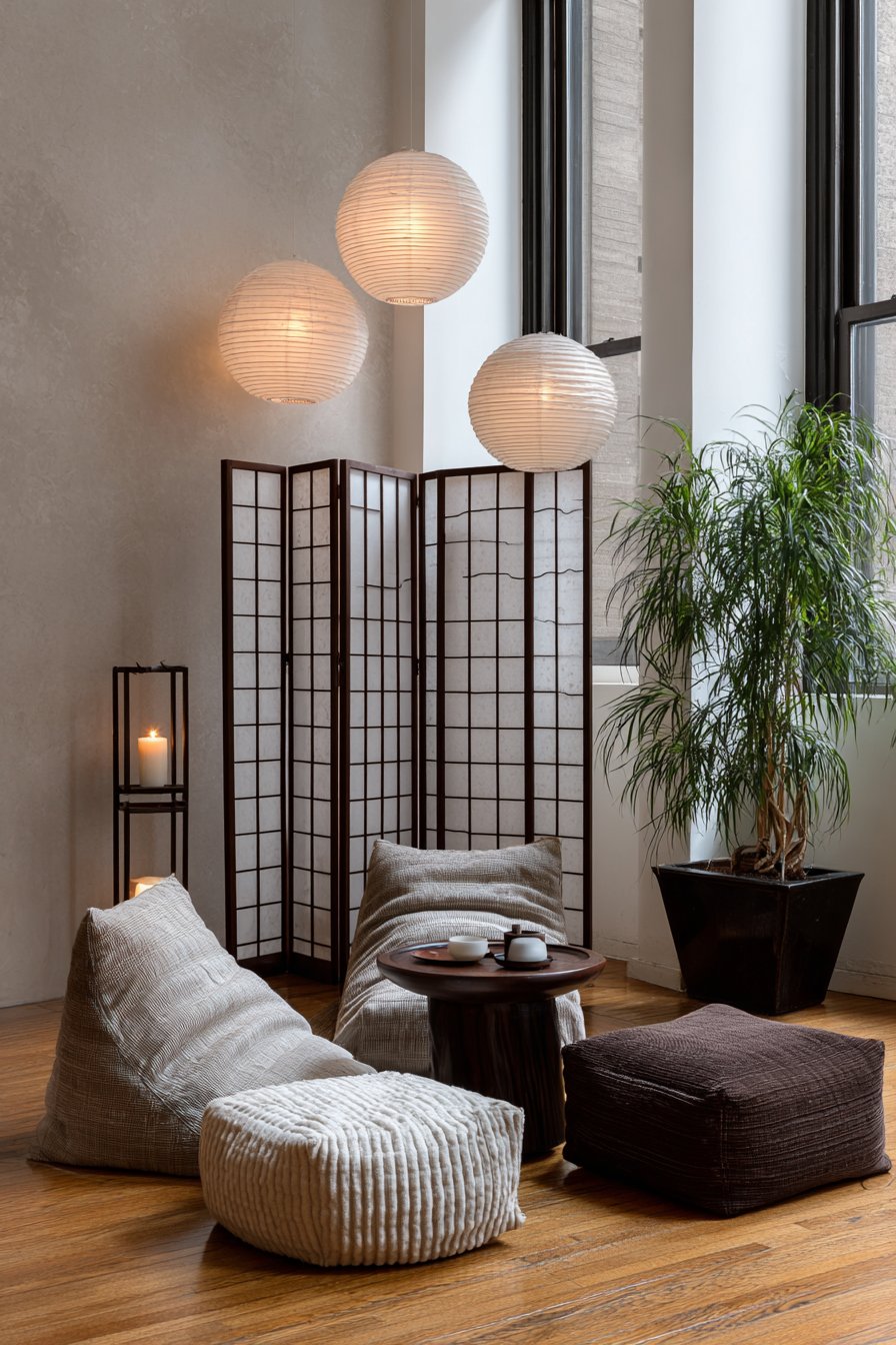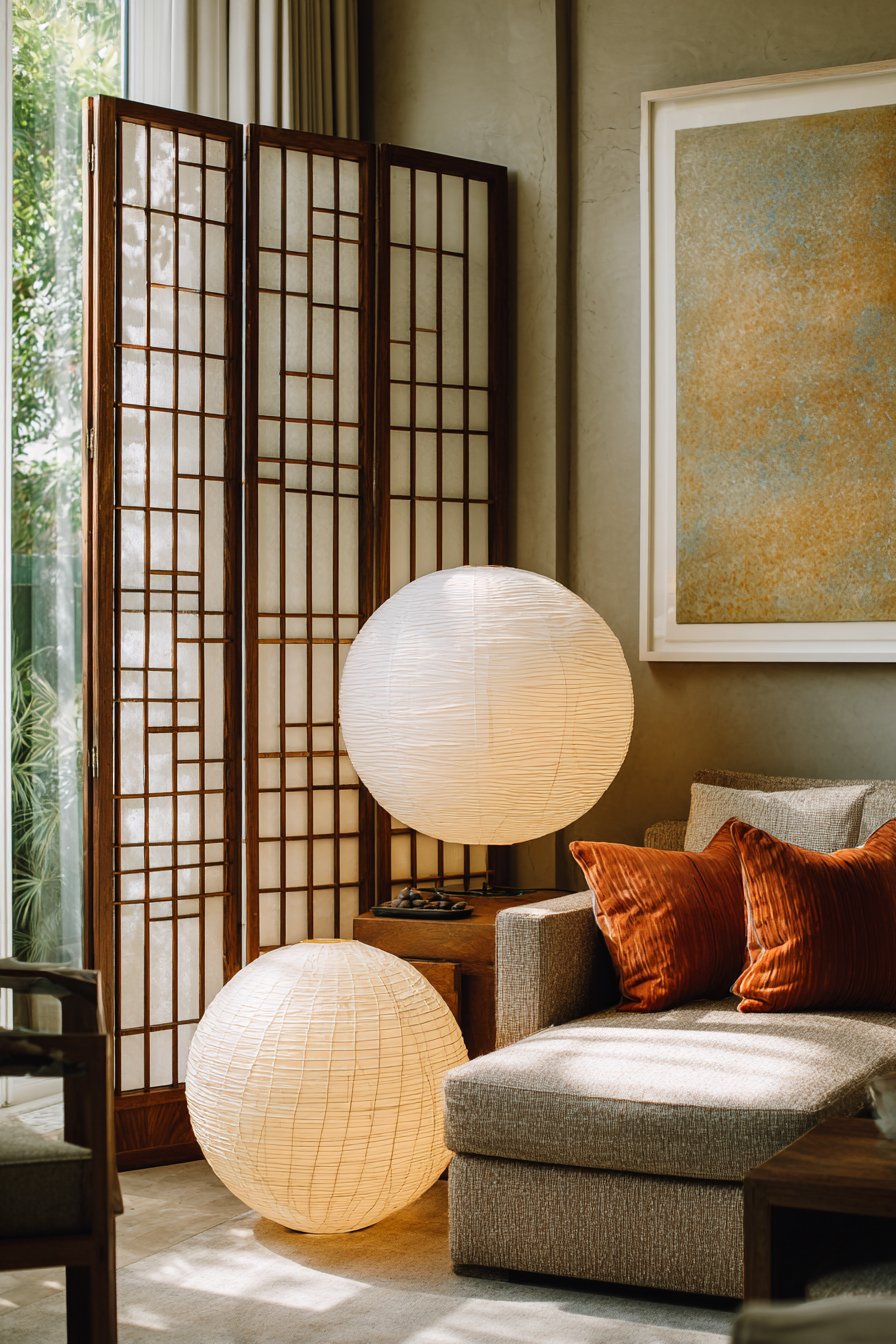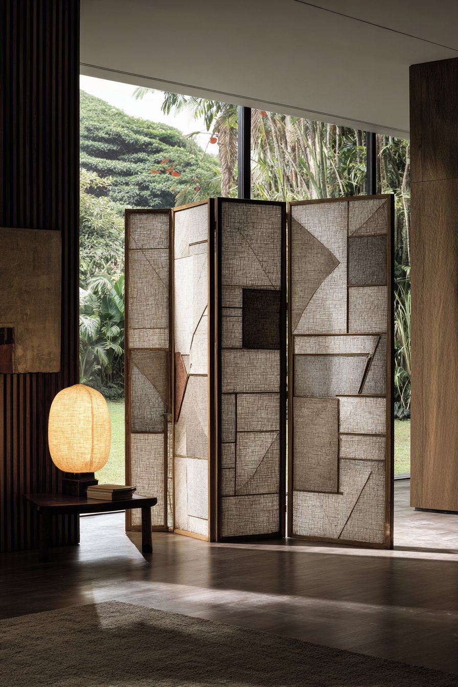 The timeless elegance of Japanese design finds expression in the shoji screen room divider, a traditional form that remains remarkably relevant in contemporary interiors. This three-panel divider features white rice paper panels stretched across dark stained wood lattice framework, creating a study in contrasts between light and dark, solid and void, opacity and translucence. The traditional design creates intimate separation between a tea corner furnished with low cushioned seating and the main living area with contemporary furniture, bridging cultural aesthetics while serving practical zoning needs. Soft natural lighting from paper lanterns complements daylight filtering through the translucent panels, creating a serene, contemplative atmosphere that promotes calm and mindfulness.