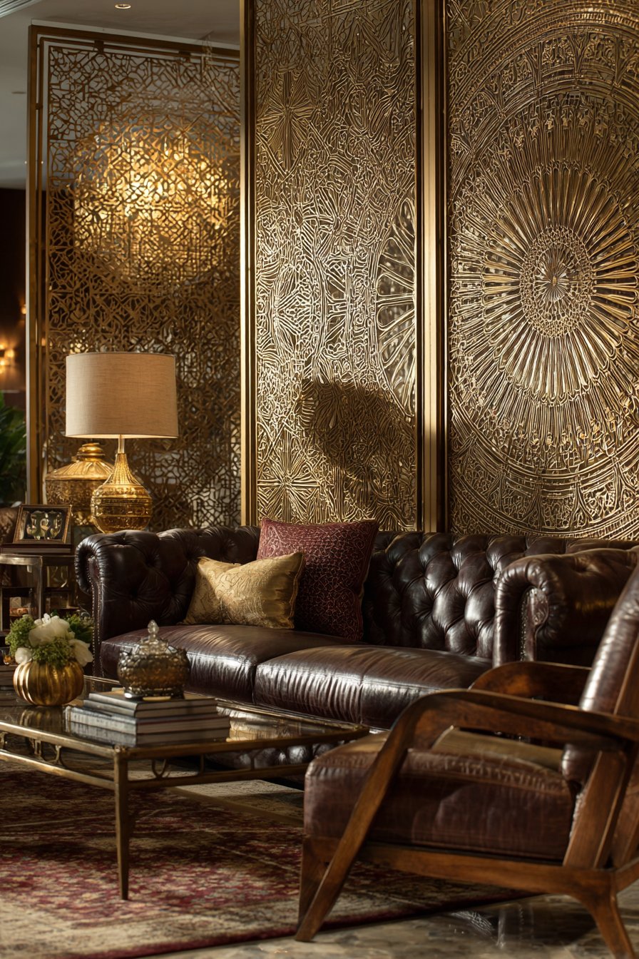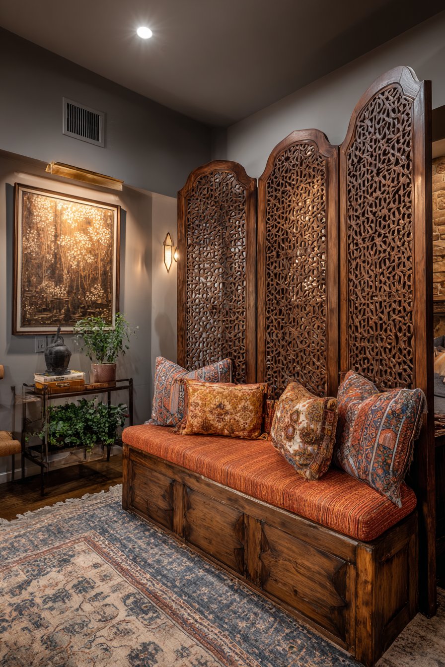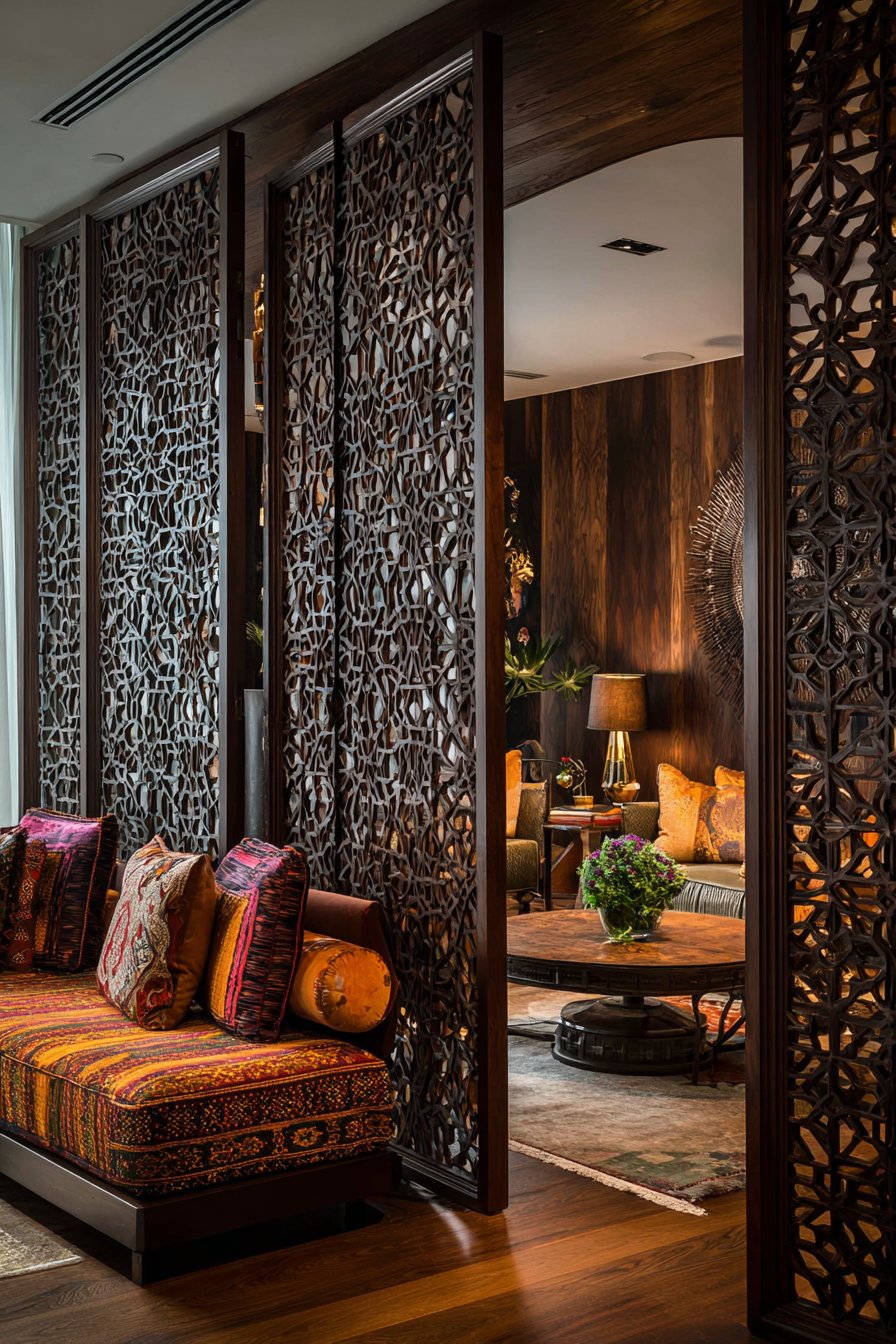 Global design influences bring exotic beauty into interiors through carved wooden screens with traditional Moroccan-inspired lattice patterns, partitions that transform room division into artistic statements. This three-panel folding screen features intricate geometric cutouts in dark walnut stain, the complex patterns derived from centuries of Islamic architectural tradition. The ornate design separates a lounge area furnished with low seating and colorful textiles from the main living space, creating intimate alcoves perfect for conversation or quiet contemplation. Ambient lighting positioned behind the screen creates dramatic pattern shadows that project onto surrounding walls, transforming the entire room into an immersive environment where light and shadow dance in geometric harmony.
