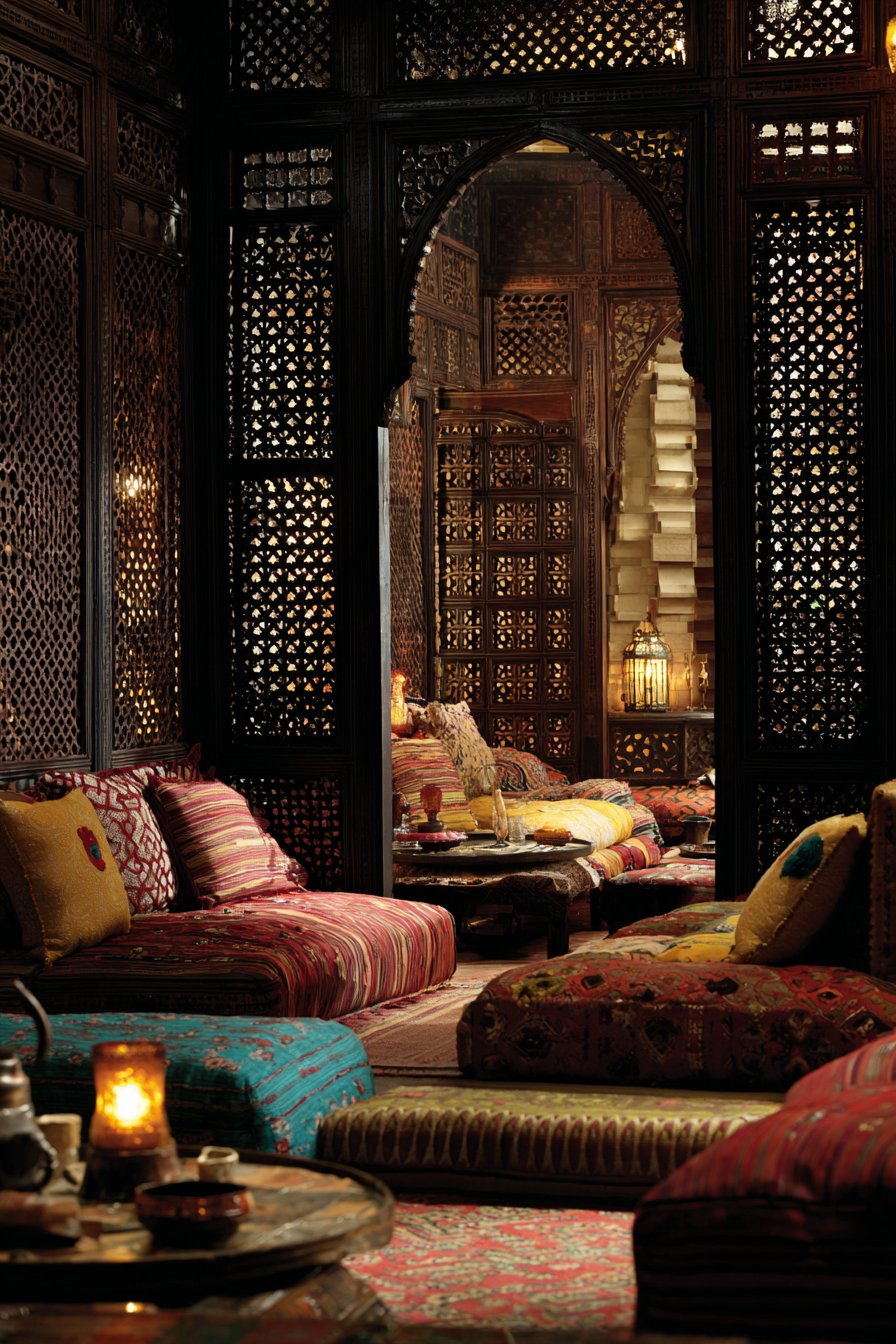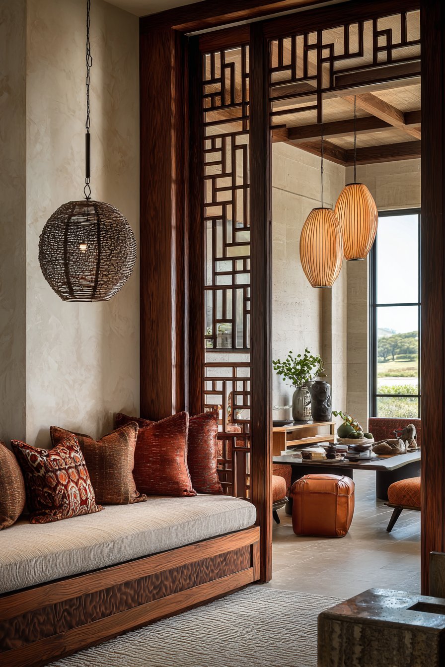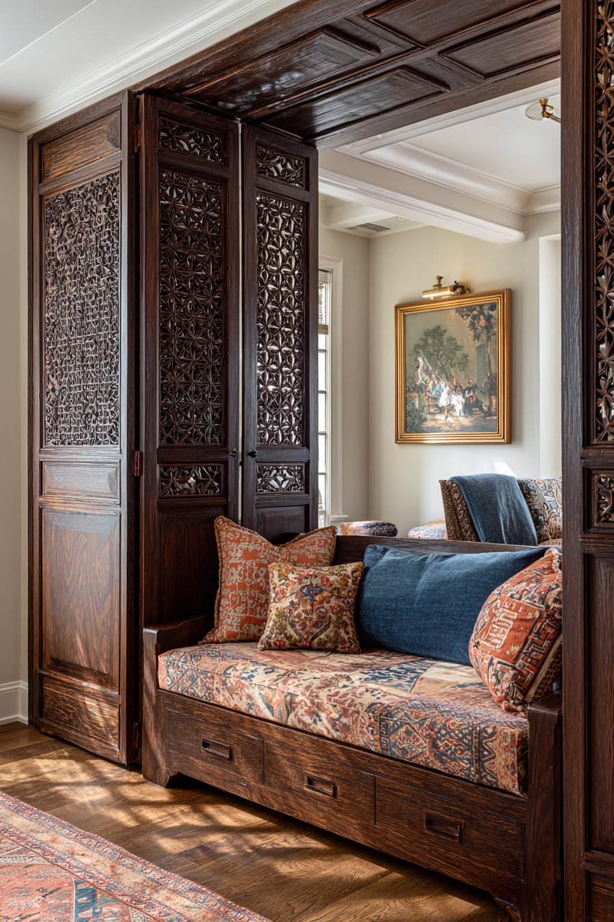 Global design influences bring exotic beauty into interiors through carved wooden screens with traditional Moroccan-inspired lattice patterns, partitions that transform room division into artistic statements. This three-panel folding screen features intricate geometric cutouts in dark walnut stain, the complex patterns derived from centuries of Islamic architectural tradition. The ornate design separates a lounge area furnished with low seating and colorful textiles from the main living space, creating intimate alcoves perfect for conversation or quiet contemplation. Ambient lighting positioned behind the screen creates dramatic pattern shadows that project onto surrounding walls, transforming the entire room into an immersive environment where light and shadow dance in geometric harmony.