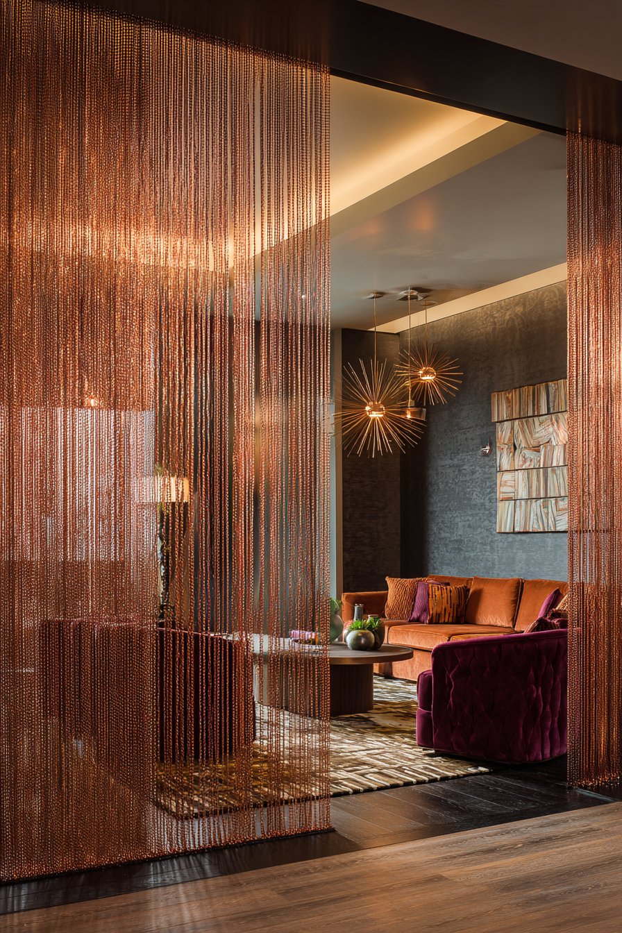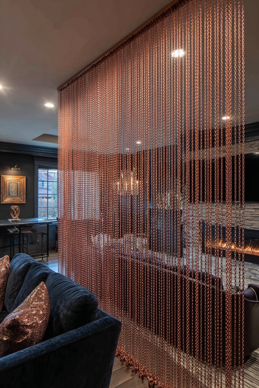 The sensory experience of this partition extends beyond visual appeal. The gentle sound of chains moving against each other creates subtle auditory texture, a soft metallic whisper that adds another dimension to the space. The tactile quality invites interaction—running fingers through chains produces satisfying sound and sensation, making the partition an engagement point rather than a mere boundary. The copper toning adds warmth that pure silver or gold tones wouldn’t provide, the burnished finish suggesting aged patina rather than shiny newness. Against a dark accent wall, the chains create striking contrast that emphasizes their linear quality and metallic gleam.