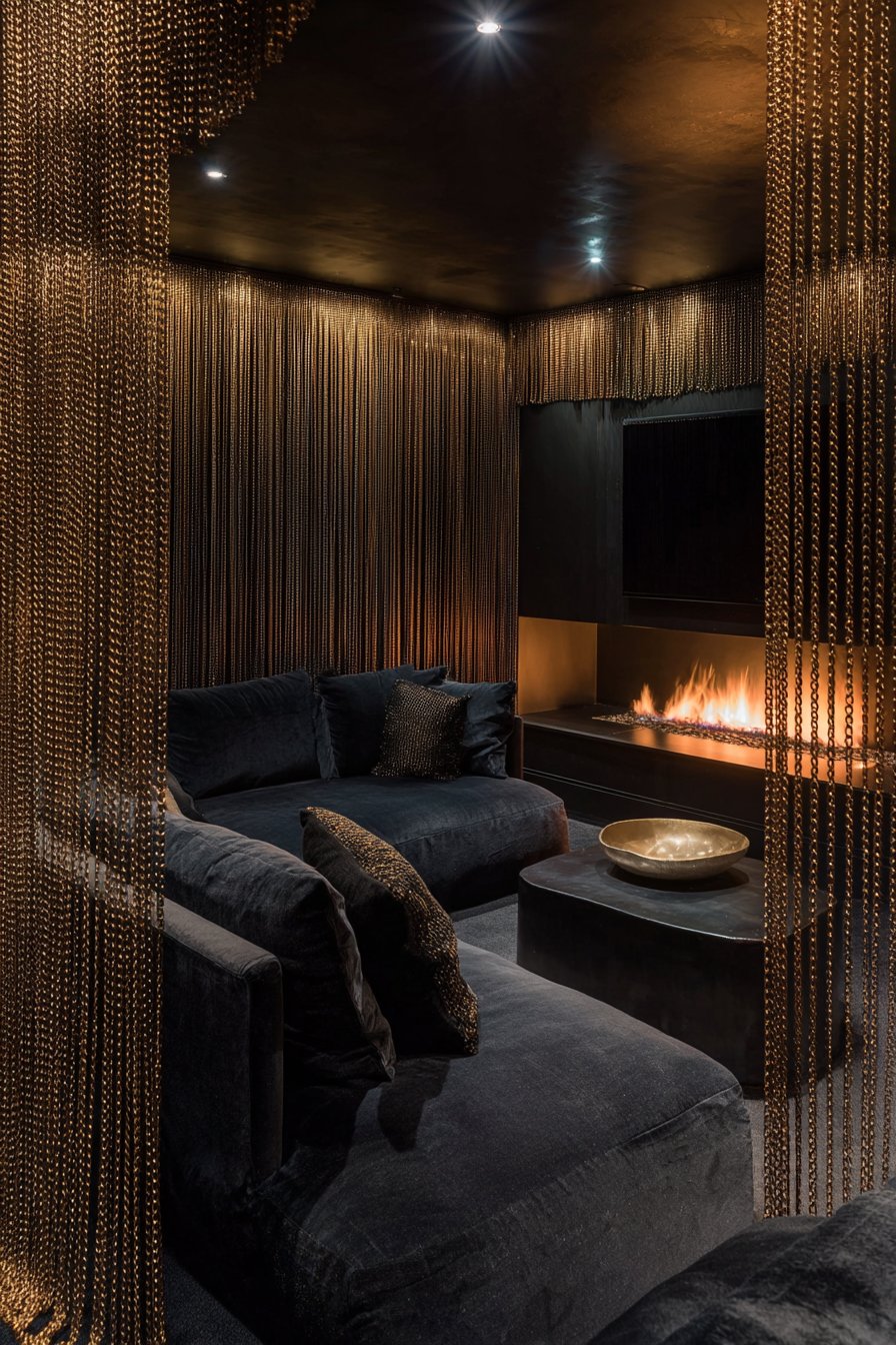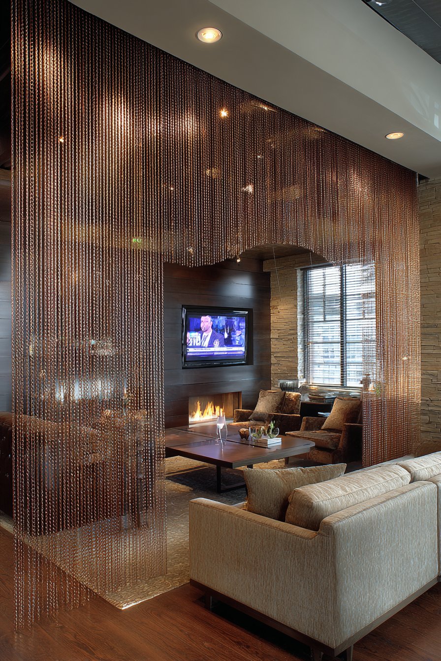 For those seeking drama and glamour in interior design, the hanging chain curtain partition offers a sculptural solution that captures and plays with light in mesmerizing ways. This unconventional divider features metallic copper-toned chains cascading from ceiling to near-floor level, their continuous vertical lines creating rhythm and movement within the space. The chains separate an intimate lounge area featuring velvet seating from an entertainment zone with media console, defining territories while maintaining visual connection. The metallic finish catches and reflects light from recessed fixtures, creating shimmering highlights that dance across the chains as they subtly move in response to air currents, bringing constant subtle animation to the space.