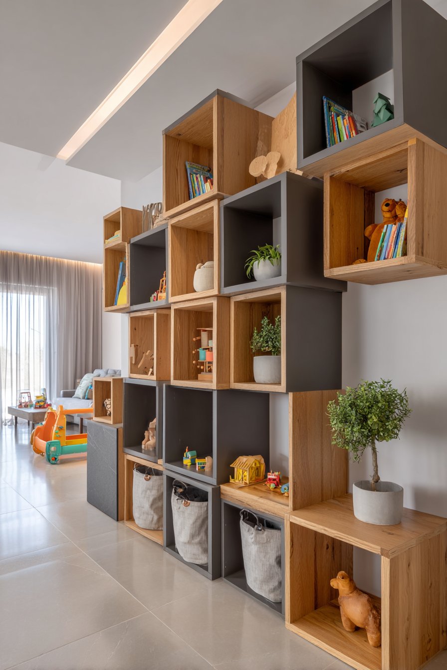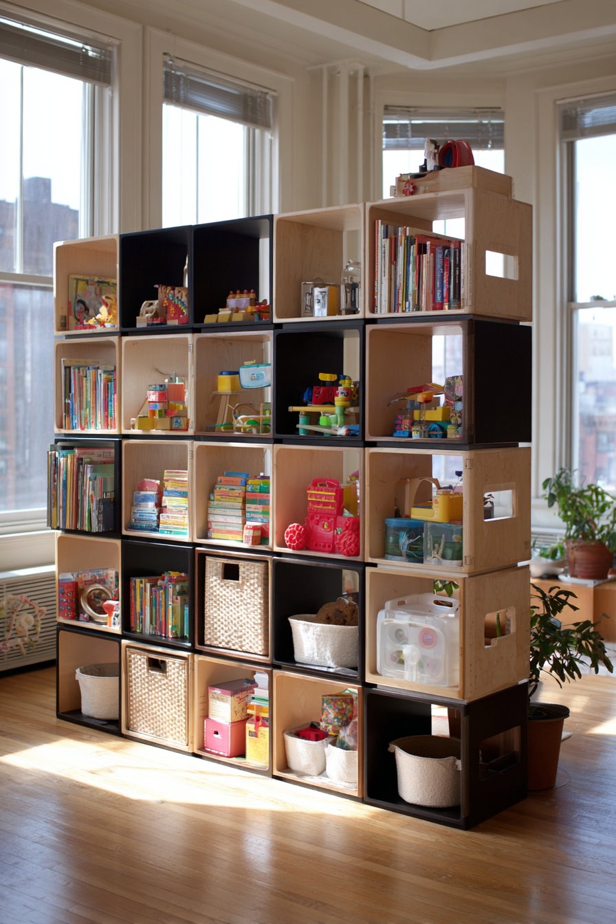The genius of this partition lies in its adaptability to changing family needs. As children grow, the contents of compartments evolve from toy storage to book displays to teen accessories, the neutral cube structure accommodating these transitions seamlessly. The modular nature means additional cubes can be added or removed as spatial needs change, offering flexibility impossible with permanent built-ins. The combination of open and closed storage addresses the reality of family life—some items deserve display while others need concealment. The accessibility from both sides means the living room can access books and games while the play area benefits from organizational systems designed specifically for children’s use.