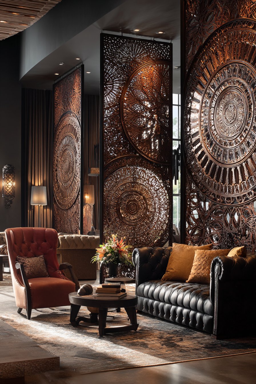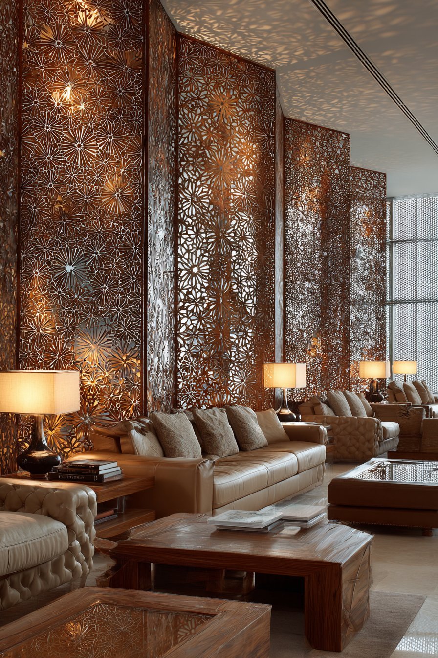 The laser-cutting process allows for pattern complexity impossible with traditional metalworking techniques, enabling designs with hundreds of precisely rendered details. The mandala motif—with its radiating symmetry and intricate details—draws the eye inward toward central focal points, creating meditative visual experiences that complement the formal seating area’s contemplative atmosphere. The bronze finish adds warmth and sophistication, the metal’s slight variations in tone and patina creating depth and visual interest. The substantial weight and solidity of metal panels create a sense of permanence and quality that lighter materials cannot match.