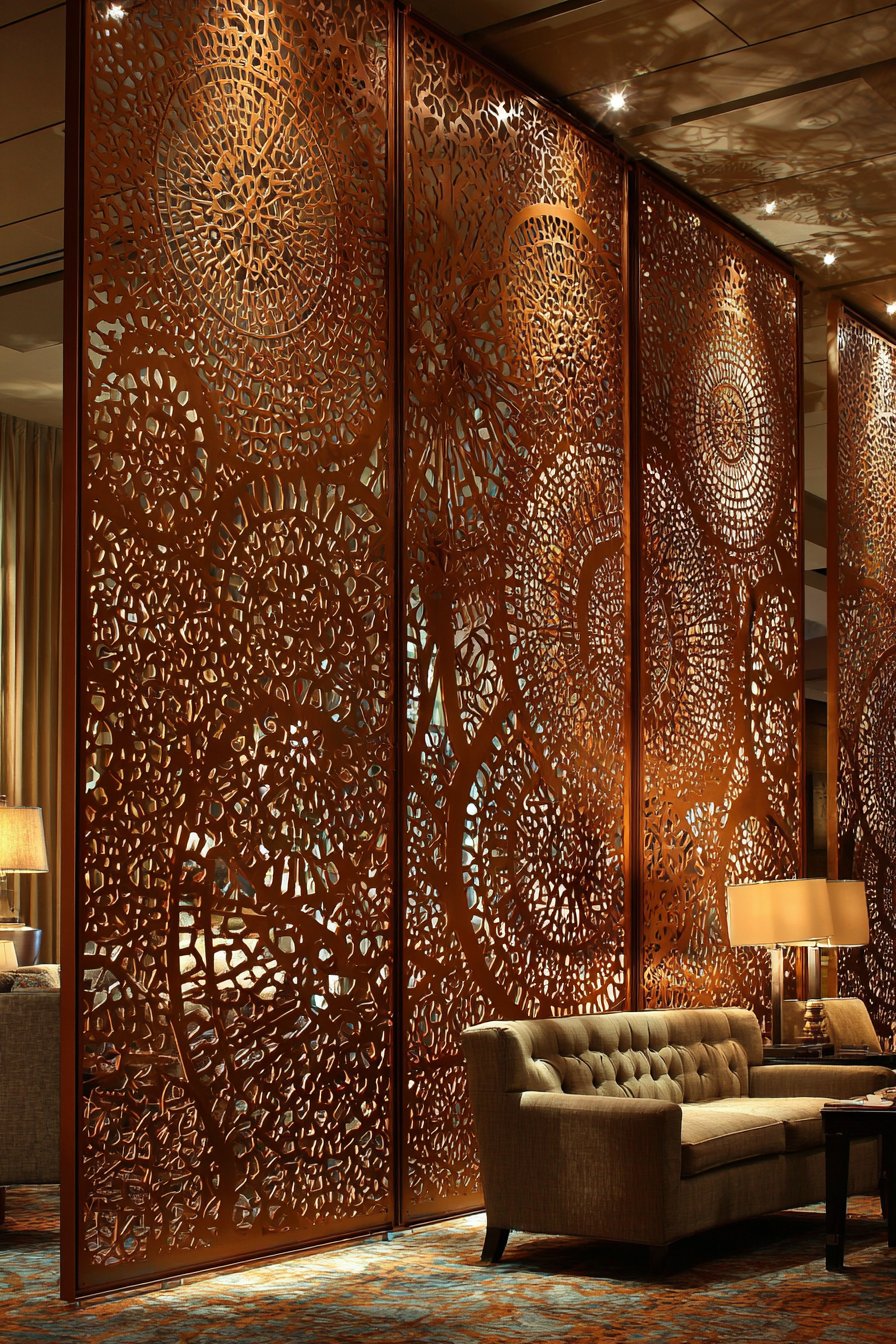 Key Design Tips: Work with experienced metal fabricators who understand laser-cutting precision requirements. Choose metal gauge thick enough for rigidity but not so heavy that panels become unwieldy. Consider the bronze finish’s maintenance requirements—some patinas require periodic sealing. Plan lighting placement carefully to maximize shadow projection effects. Position panels on stable flooring that won’t allow wobbling. Consider the weight of metal panels when determining if they’ll be moved frequently or remain in place. Coordinate the pattern style with other decorative elements in the space. Clean panels regularly to maintain the precision of cut patterns—dust can accumulate in intricate details. Consider how patterns look from both sides as some designs are directional. Ensure panels are properly stabilized with weighted bases or floor anchoring for safety.