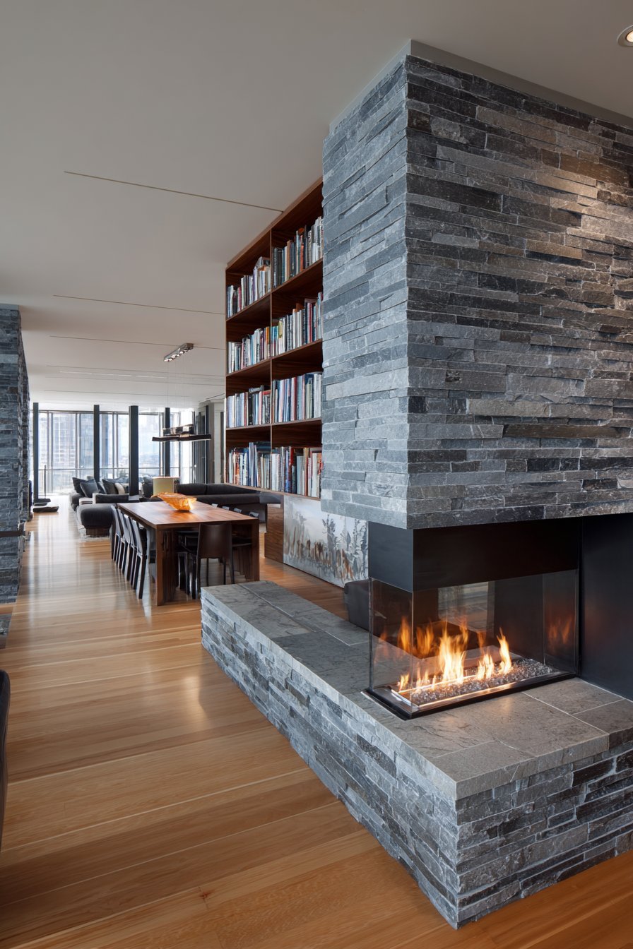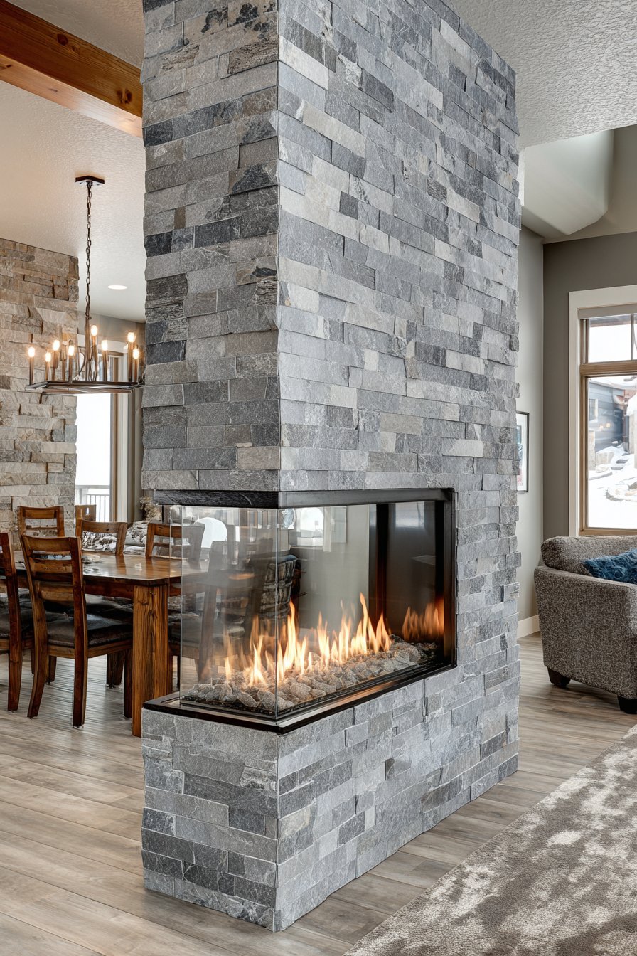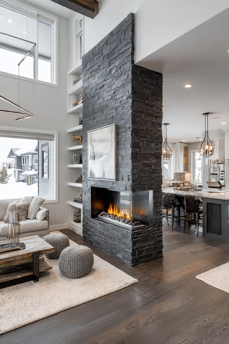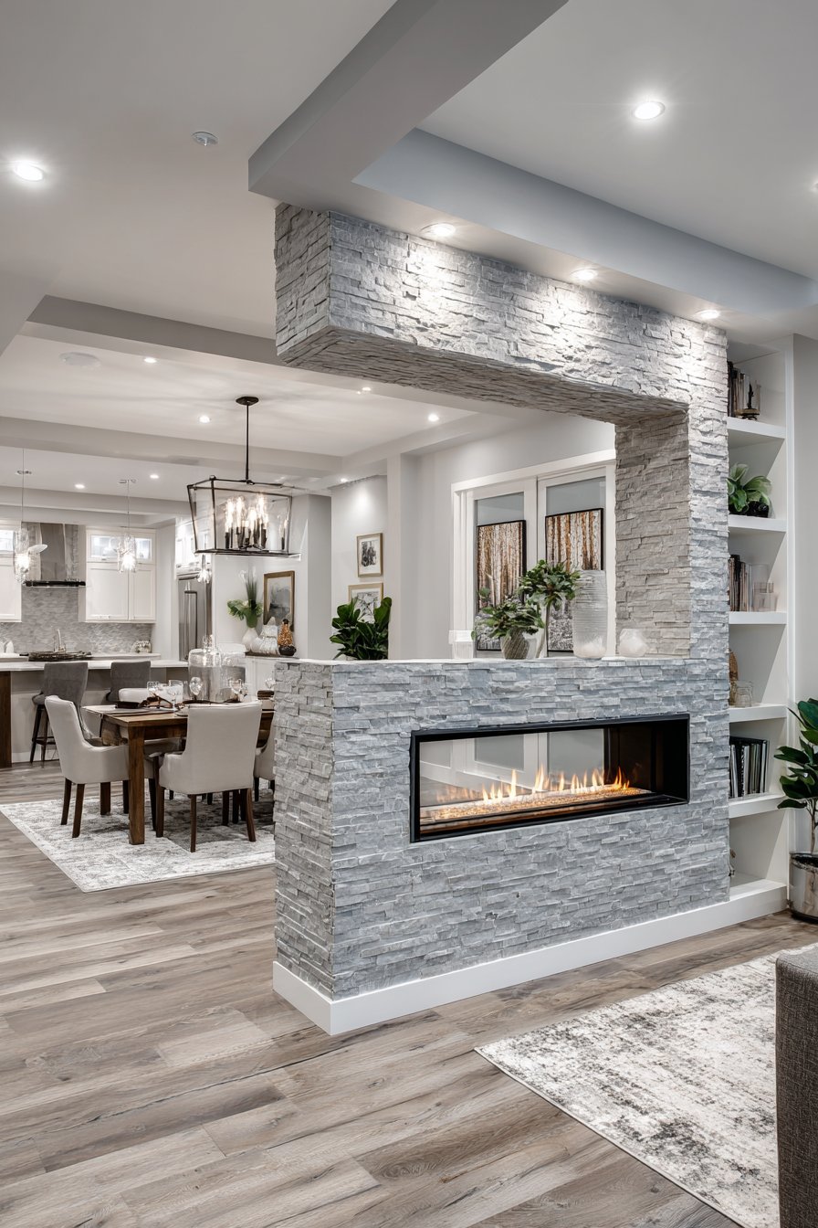 Few partition elements combine functionality, architectural presence, and ambiance as effectively as the double-sided fireplace, a feature that transforms room division into an experiential centerpiece. This contemporary design features a linear gas insert housed within a floor-to-ceiling surround of grey slate tile arranged in horizontal stacking pattern, the stone’s natural texture and color variations creating organic visual interest. The fireplace separates open-concept living from the dining area while providing warmth and ambiance to both spaces simultaneously, its flames visible from multiple viewing angles creating focal points in each zone. Built-in recessed shelving flanks each side, offering display opportunities for art, books, or decorative objects that personalize the architectural feature.