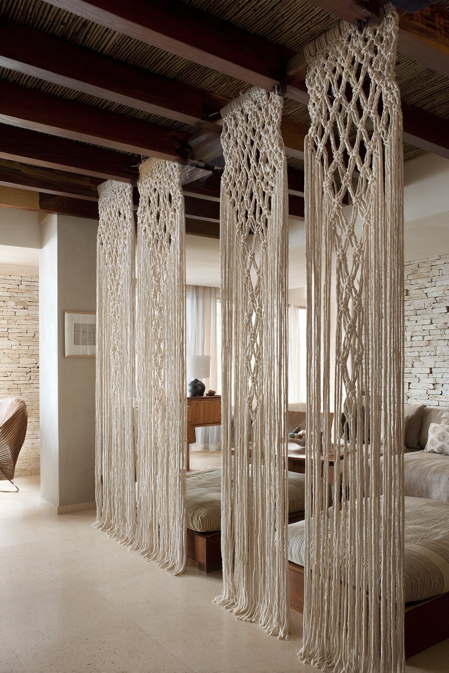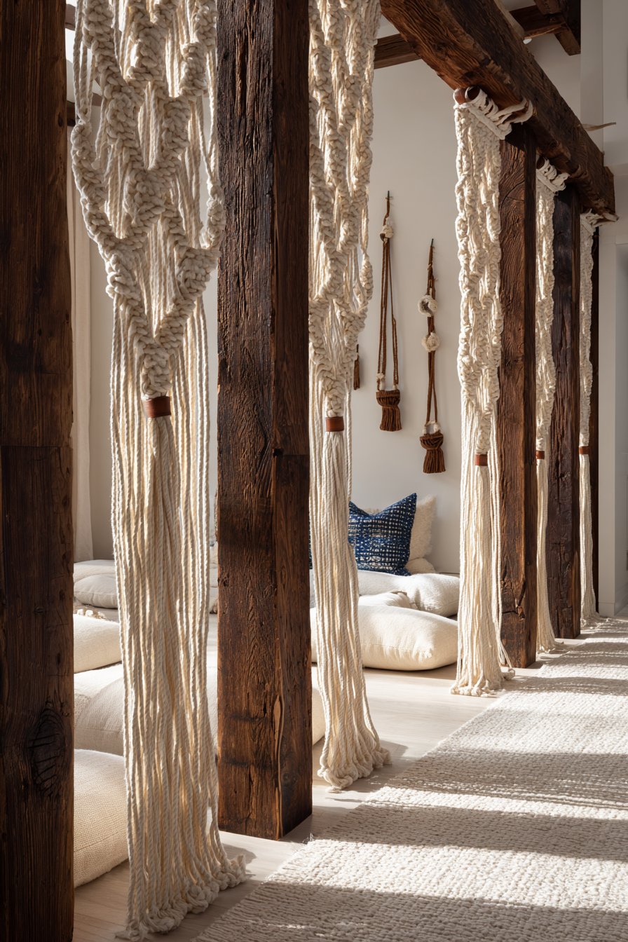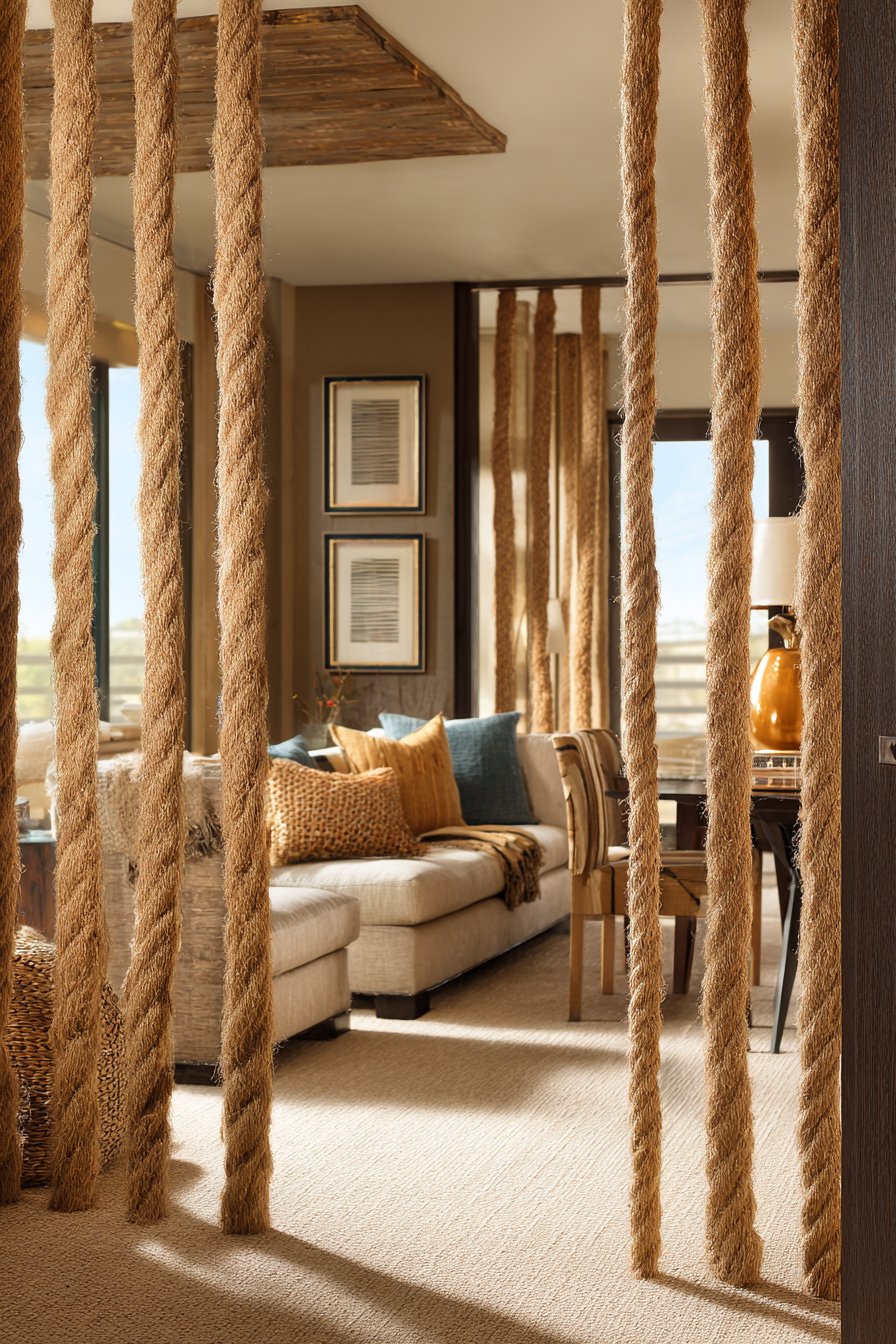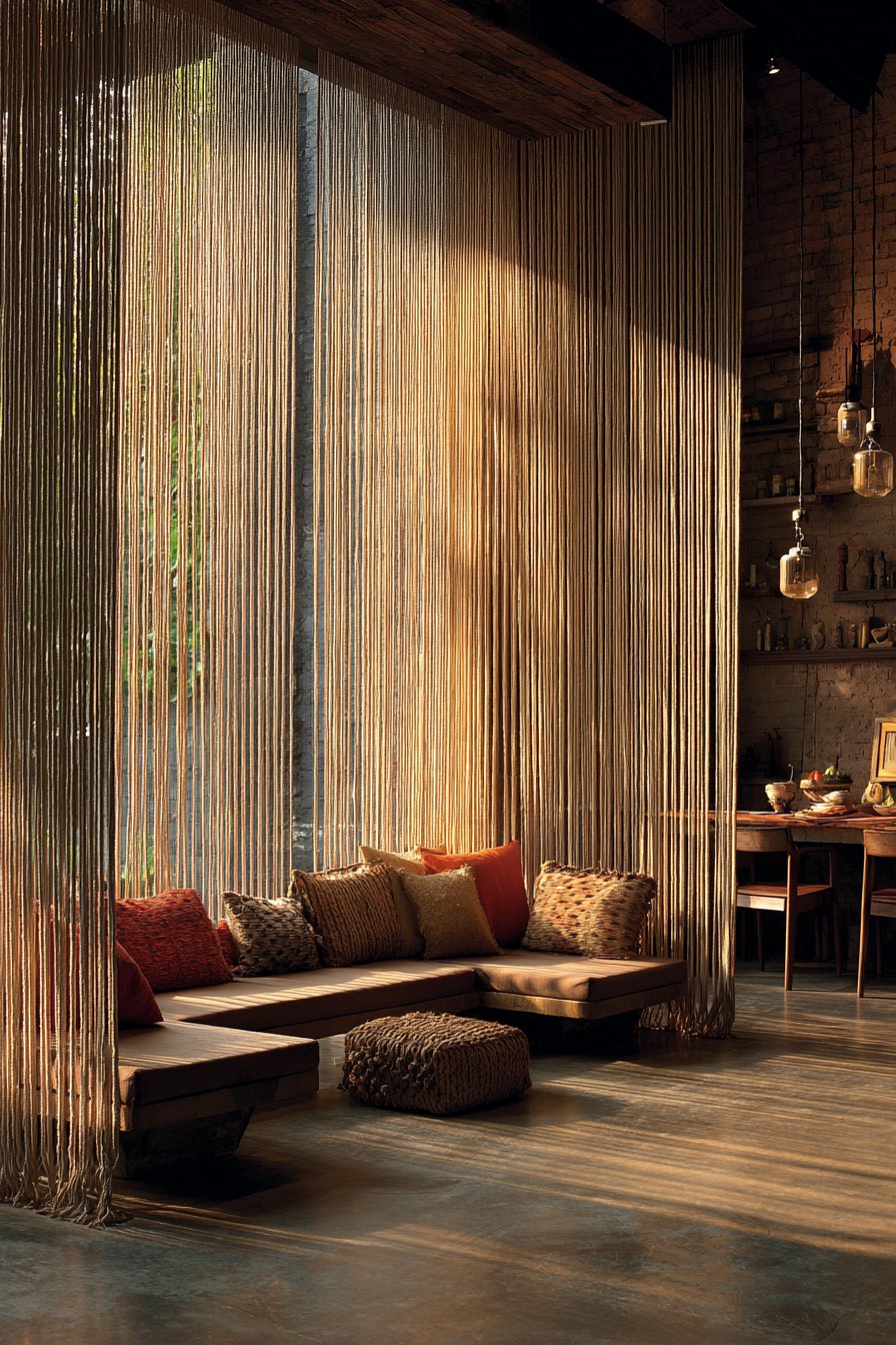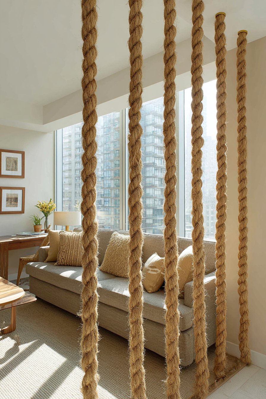 For those drawn to coastal aesthetics and organic materials, rope dividers offer a uniquely tactile partition solution that brings natural texture and movement into interior spaces. This bohemian-inspired design features thick natural jute ropes suspended from ceiling-mounted brass hardware, their substantial diameter creating visual presence while their soft composition maintains a relaxed, informal atmosphere. The vertical rope strands hang at varying lengths, creating visual rhythm and interest while allowing maximum light and air flow between zones. This partition approach separates a cozy lounge area furnished with textured throw pillows and a low-profile sofa from a small workspace, defining territories without visual heaviness.