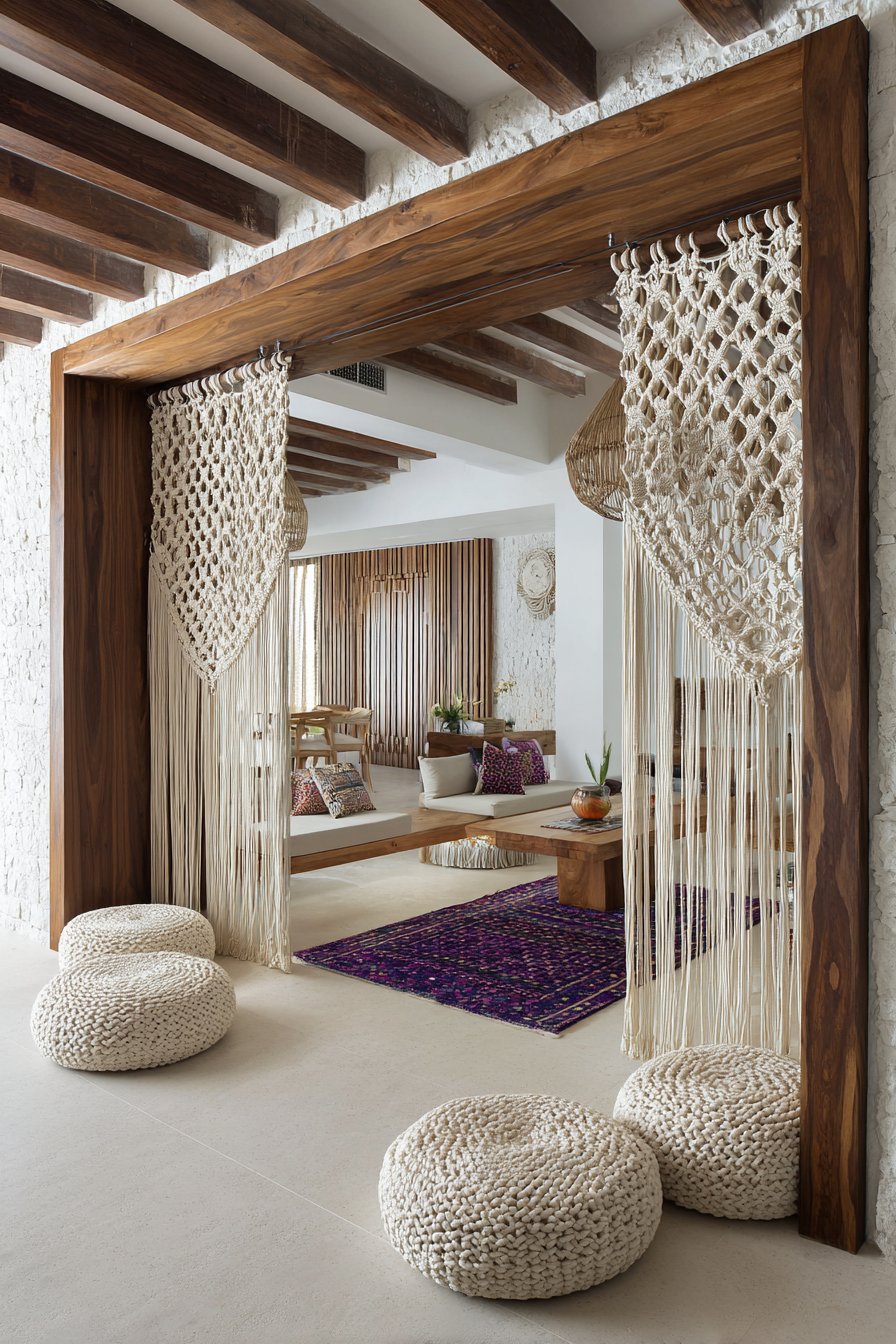 Key Design Tips: Source high-quality cotton rope specifically designed for macrame to ensure consistent thickness and texture. Learn basic macrame knots or hire skilled fiber artists for custom pieces. Ensure ceiling mounting hardware can support the weight of completed panels. Consider treating cotton with stain-resistant spray for longevity, especially in high-traffic areas. Plan panel dimensions based on the space you want to divide—too small and they won’t create meaningful separation. Hang panels at heights that provide coverage while allowing floor clearance for easy passage. Clean macrame regularly with gentle vacuum attachment to prevent dust accumulation in rope fibers. Consider the maintenance implications of natural materials—cotton can yellow over time with sun exposure. Coordinate wooden dowel stain with other wood tones in your space. Ensure leather hanging straps are properly secured and inspected periodically for wear.