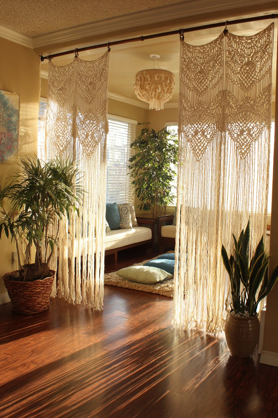 This partition style embodies the bohemian aesthetic’s celebration of handcraft, natural materials, and artistic expression. Each macrame panel represents hours of skilled handwork, making it fundamentally different from mass-produced partition solutions. The natural cream color coordinates effortlessly with bohemian palettes rich in earth tones, though macrame can be created in various colors for those seeking bolder statements. The portability of hanging dividers allows seasonal rotation or complete removal when open floor plans are desired. The DIY potential appeals to crafters who might create their own macrame partitions, adding personal creative satisfaction to functional home improvement.