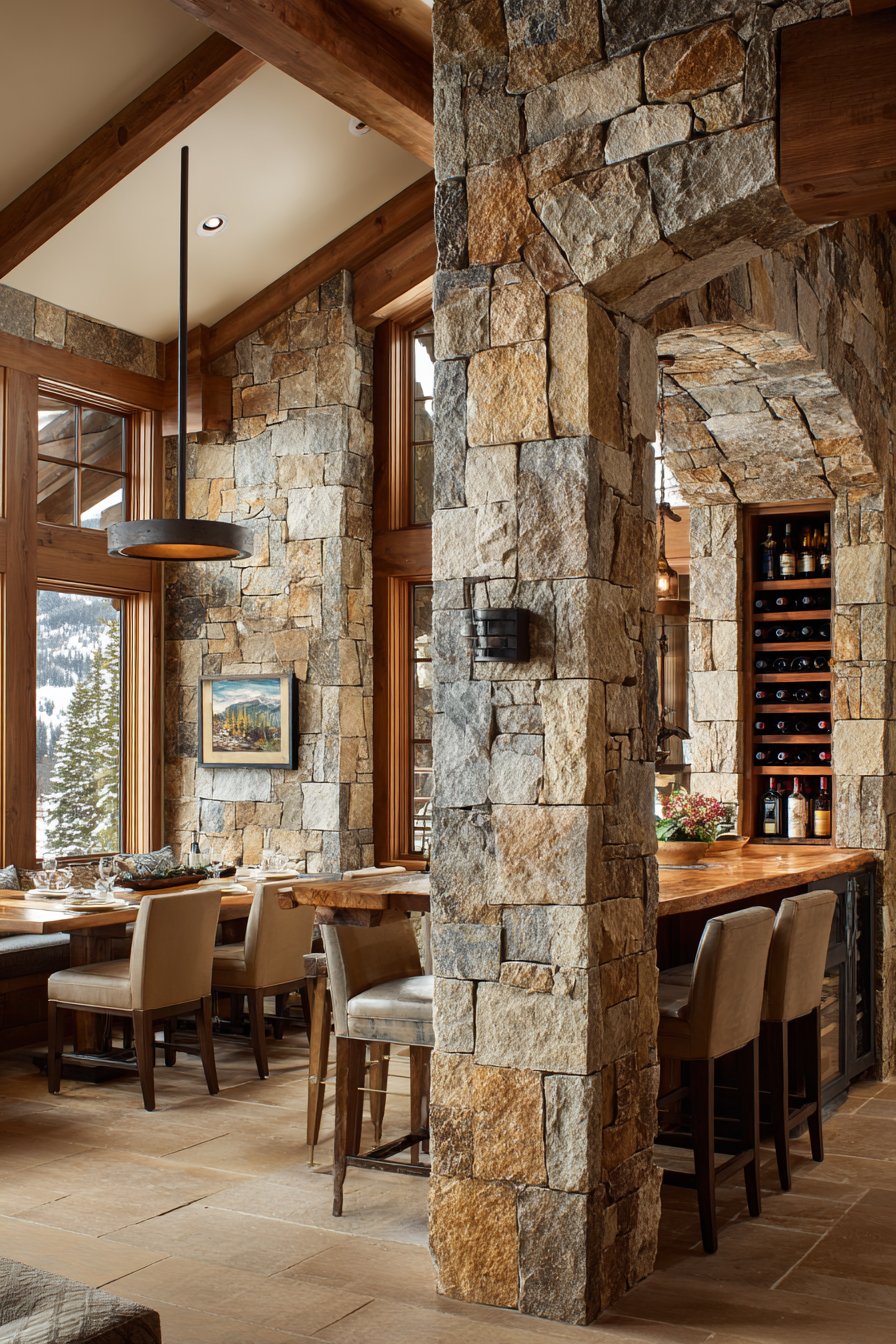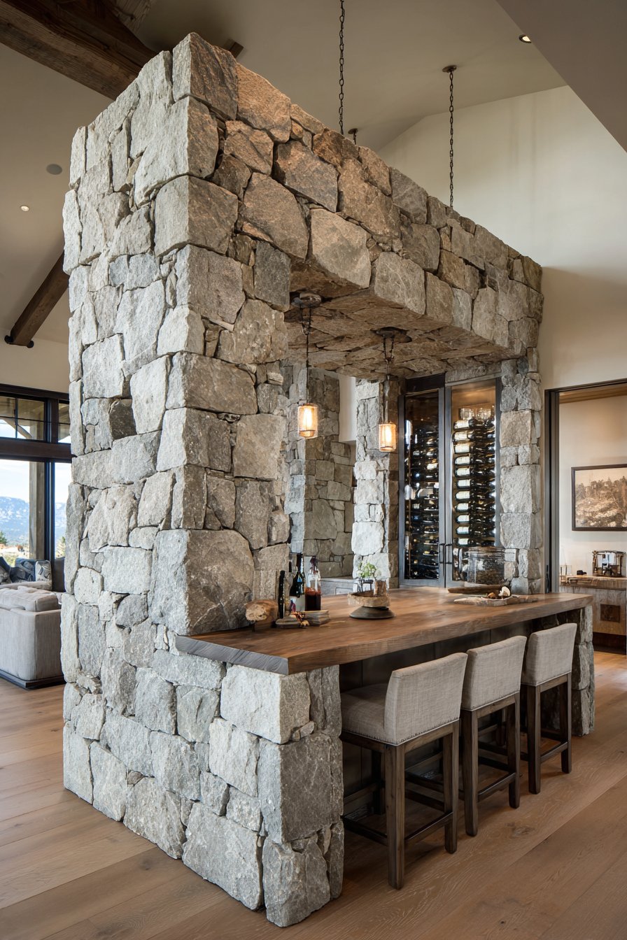 This partition style particularly suits homes with rustic, transitional, or lodge aesthetics where natural materials and substantial construction are valued. The stone’s organic quality brings outside elements inside, creating connection to natural landscapes. The half-wall height maintains visual connection between spaces while clearly defining different functional zones. The wooden beam countertop’s warmth and organic grain prevent the stone from feeling cold or austere, while also providing practical surface for setting drinks, displaying floral arrangements, or serving appetizers during gatherings. The built-in wine storage demonstrates how thoughtful partition design can incorporate specialized functions rather than simply occupying space.