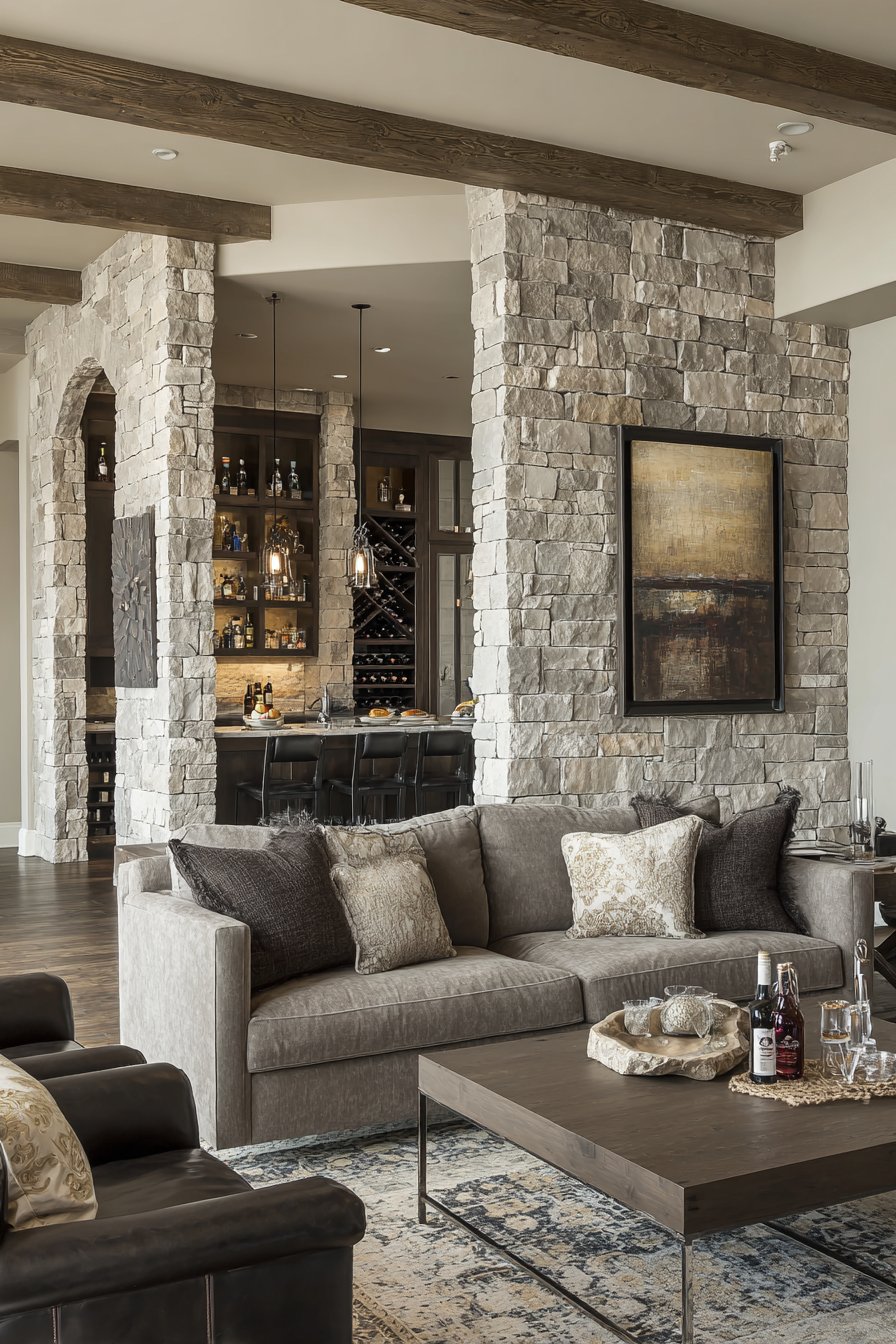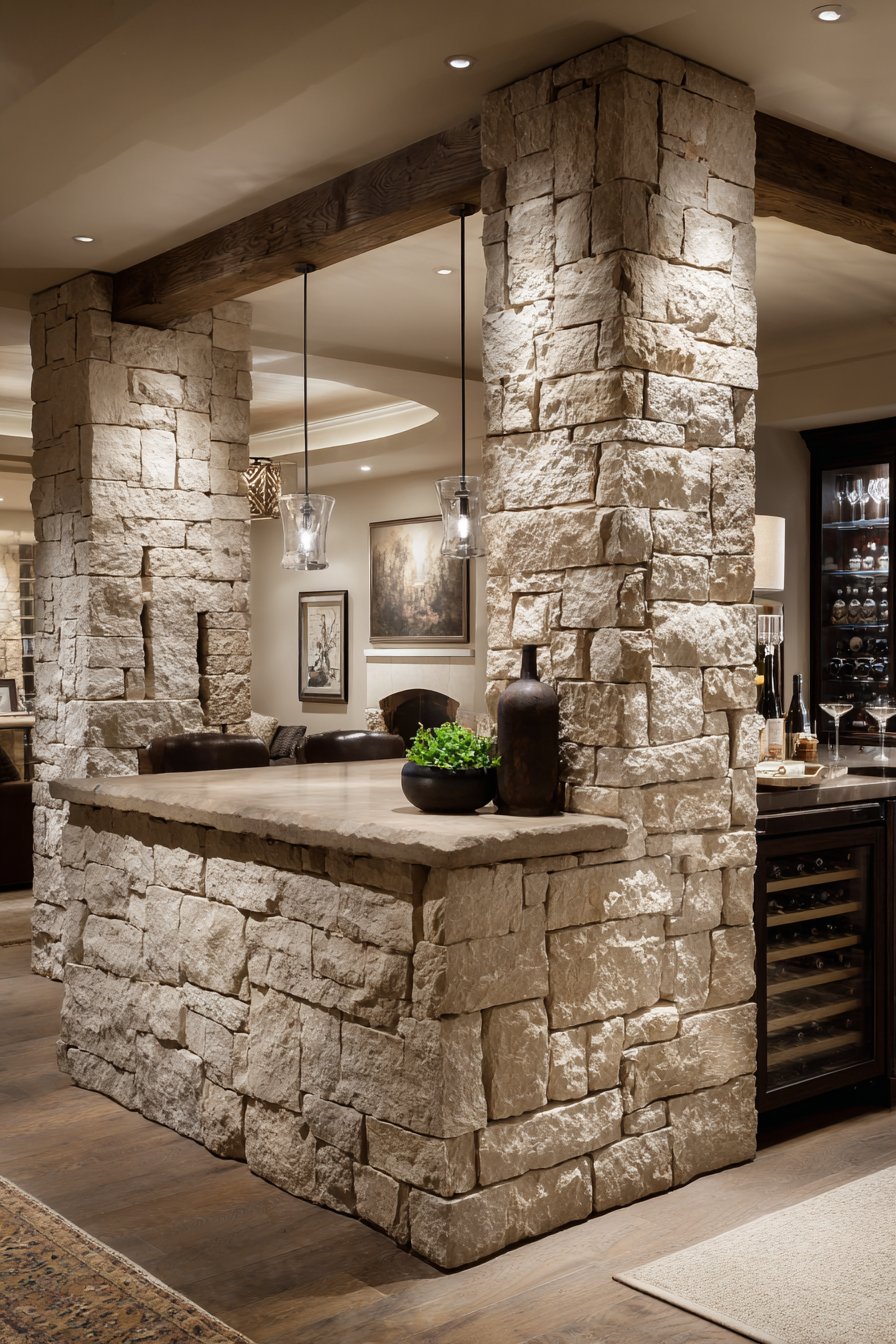 For those who appreciate substantial, permanent architectural elements with natural material authenticity, the stacked stone veneer half-wall partition offers enduring beauty and solid presence. This design features natural stones in grey and taupe tones, their irregular shapes and varied textures creating organic visual interest impossible to achieve with manufactured materials. The masonry element separates the living area from a home bar or beverage station, topped with a solid wooden beam countertop that provides practical serving surface and material contrast. Built-in wine storage visible on one side adds functionality while warm pendant lighting positioned above highlights the stone’s texture variations and the wood’s grain patterns.