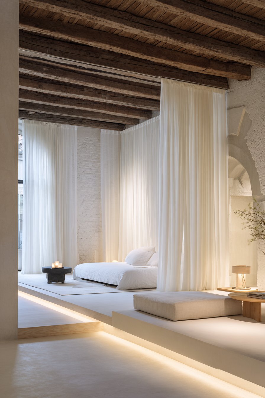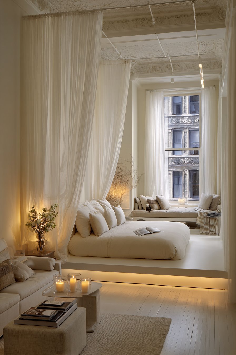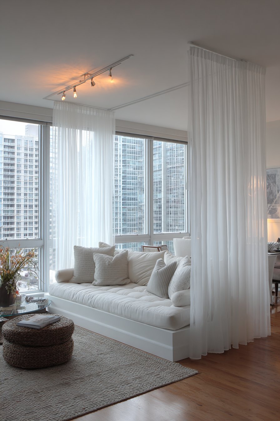 Space-saving ingenuity meets ethereal beauty in the tension-mounted pole system with flowing sheer curtain panels, a partition solution particularly well-suited to studio apartments and compact living spaces. This design features lightweight fabric in soft white that gently separates a sleeping alcove with platform bed from the main living space, creating privacy without visual heaviness or permanent modifications. The ceiling-mounted track system allows curtains to slide smoothly along their course, opening completely to unite the space or closing for nighttime privacy or daytime naps. The sheer quality of the fabric ensures that even when closed, natural lighting filters through creating luminous ambiance that prevents the sleeping area from feeling dark or enclosed.