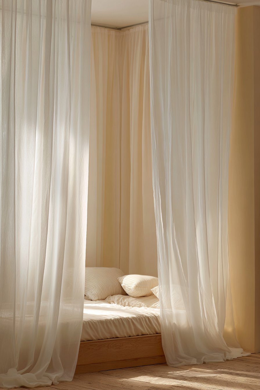 Key Design Tips: Choose tension rods rated for the curtain weight and span distance. Ensure ceiling and walls can support tension mounting pressure without damage. Select sheer fabrics with enough weight to hang properly without excessive billowing. Consider blackout liners that can attach when complete darkness is desired for sleeping. Plan curtain length to brush the floor gently without excessive puddling that creates trip hazards. Choose hardware finishes that coordinate with other metals in the space. Consider double-track systems if you want both sheer and blackout options. Maintain the curtains with regular gentle washing to prevent dust accumulation that can dull their luminous quality. Test the sliding mechanism regularly to ensure smooth operation. Consider tiebacks or holdbacks to secure curtains when open for completely unobstructed space. Plan for curtain coverage that slightly overlaps when closed for privacy. Choose washable fabrics for practical maintenance.