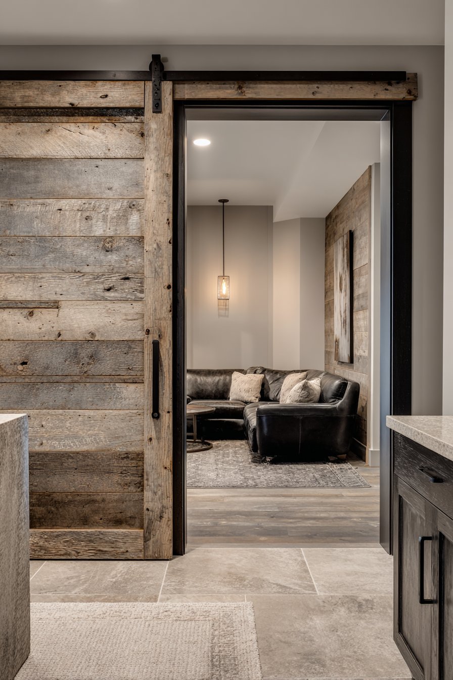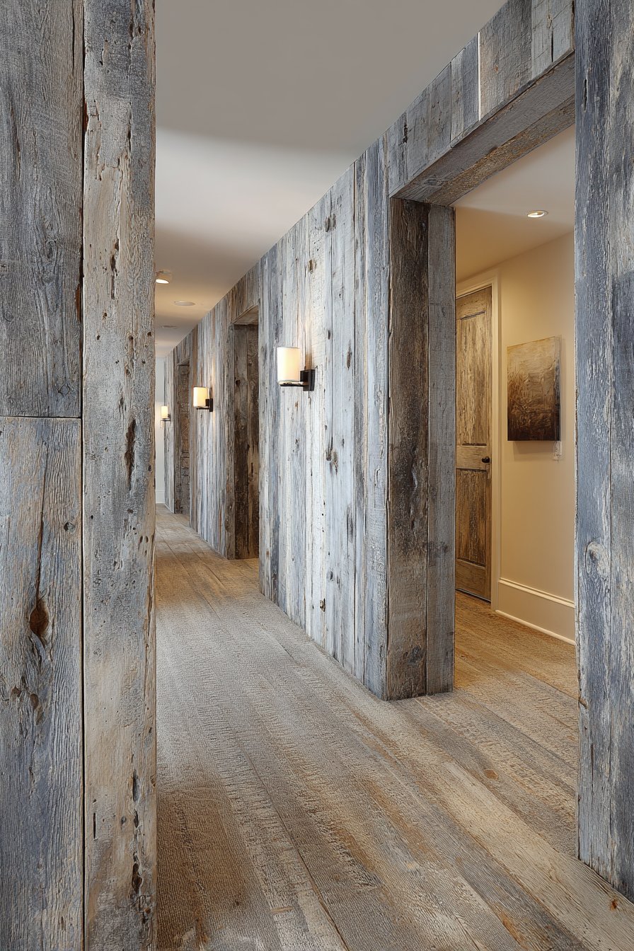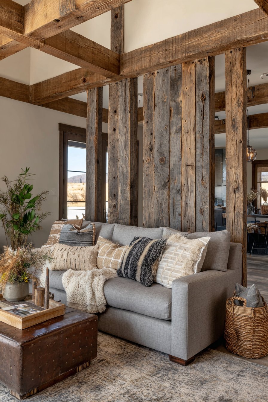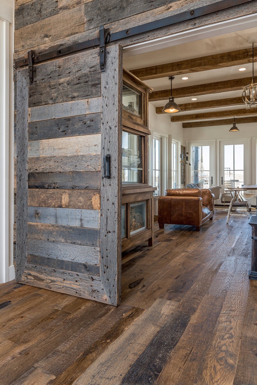 Authenticity and sustainability converge in the reclaimed barn wood plank partition, a design element that brings historical character and environmental consciousness into contemporary interiors. This floor-to-ceiling installation features weathered grey wood with visible nail holes, authentic wear patterns, and natural aging that new materials cannot replicate. The horizontal plank arrangement creates strong linear emphasis while showcasing each board’s unique history—varied wood tones, distinctive grain patterns, and honest imperfections that tell stories of decades past. The rustic farmhouse partition separates open living from the mudroom entry area, creating practical screening for coats and shoes while establishing aesthetic continuity with farmhouse design principles. Vintage industrial hardware accents complement the aged wood character.