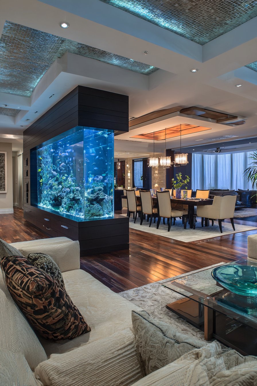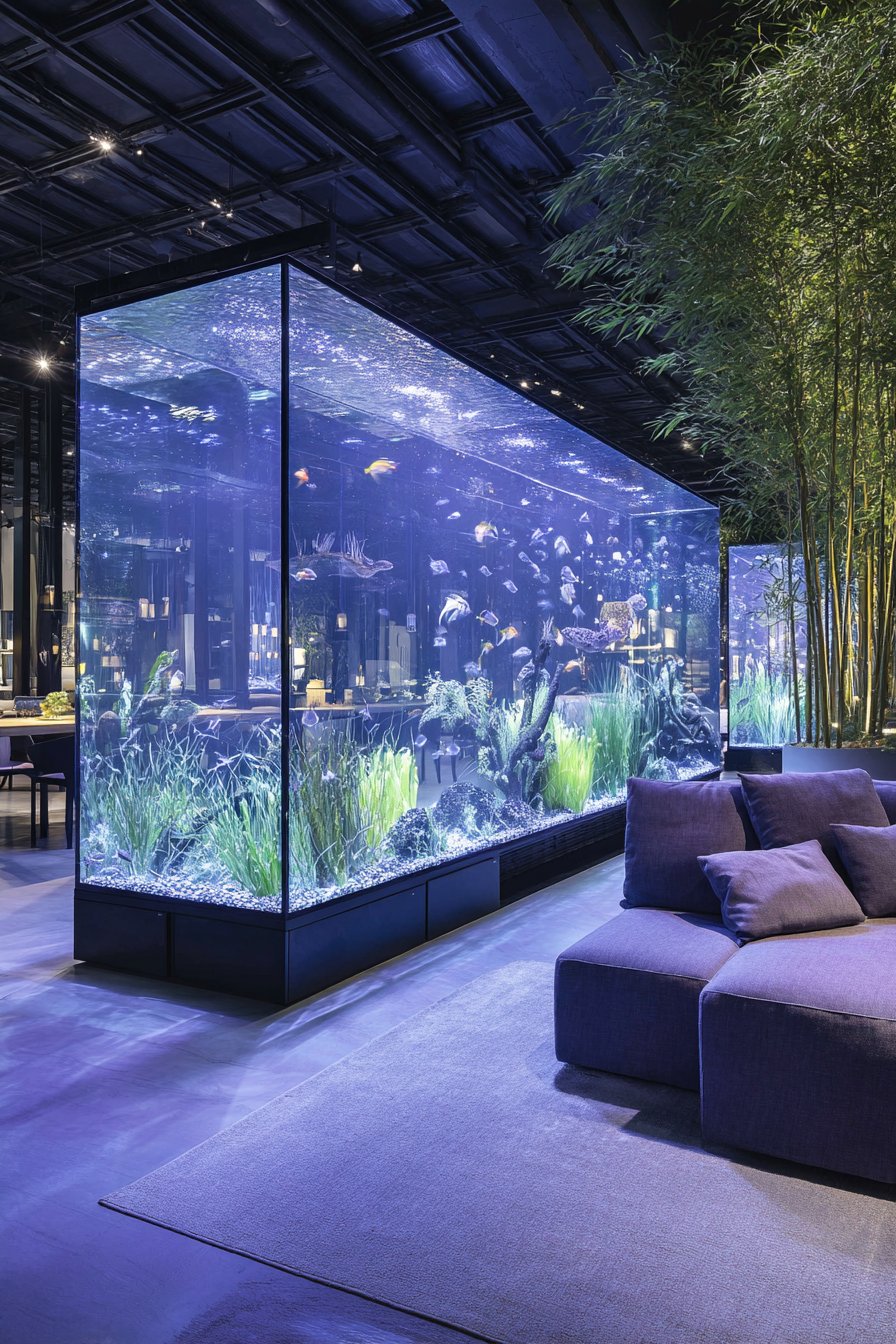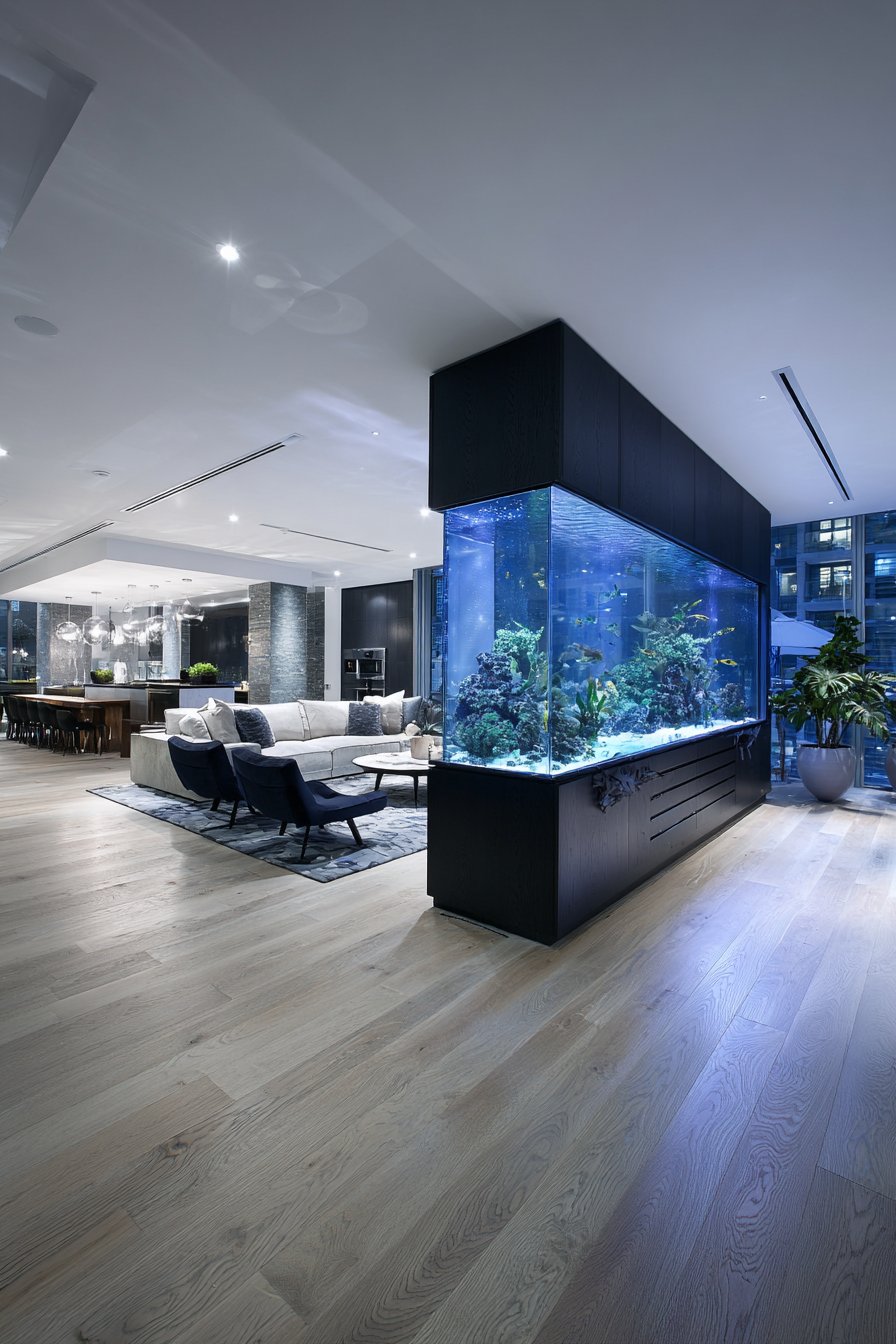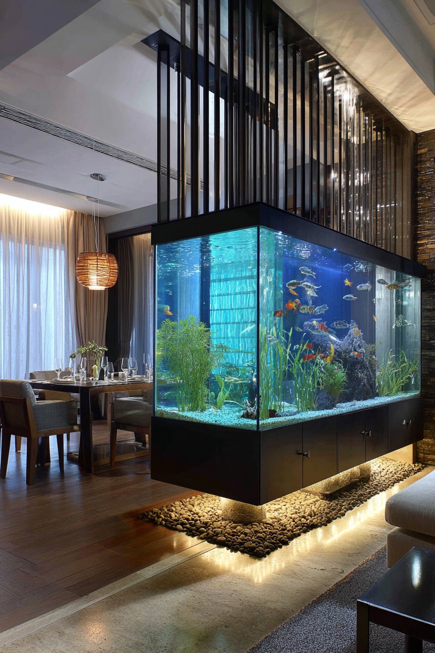 Key Design Tips: Work with experienced aquarium installers for proper tank sizing, support structure, and equipment integration. Ensure floor can support the substantial weight of water, gravel, decorations, and the tank itself. Plan for regular maintenance access—all equipment should be easily reachable. Choose fish species appropriate for the tank size and compatible with each other. Research proper filtration and circulation requirements before installation. Consider automatic feeding systems if you travel frequently. Plan for backup power solutions to protect fish during electrical outages. Maintain consistent water temperature and chemistry for fish health. Choose aquatic plants that match your lighting and can thrive in your fish’s environment. Budget for ongoing costs including electricity, food, replacement filters, and occasional equipment repairs. Consider starting with hardy fish species if you’re new to aquarium keeping. Install adequate structural support to handle the partition’s weight. Plan for how you’ll handle aquarium maintenance without disrupting living spaces. Consider professional aquarium maintenance services if DIY upkeep seems overwhelming.