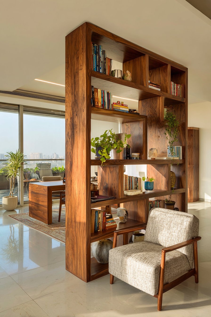 The genius of this partition design lies in its multifunctionality. Beyond its obvious storage capabilities, the bookshelf creates a soft, textured boundary that feels far more inviting than a solid wall. The varied heights and depths of objects on the shelves create visual interest and rhythm, while strategically placed gaps allow glimpses through to the other side, maintaining a sense of connection between spaces. On the living room side, a cozy reading chair upholstered in textured fabric invites relaxation with a book pulled from nearby shelves. The home office side features a minimalist desk setup that benefits from both the partition’s organizational capacity and its acoustic dampening properties—books and objects naturally absorb sound, creating quieter, more focused work environments.