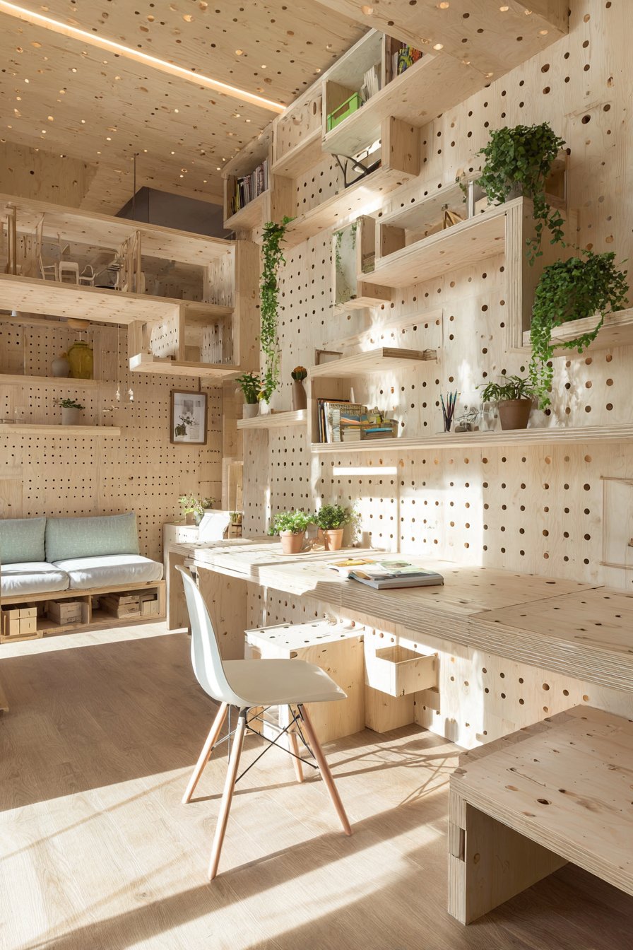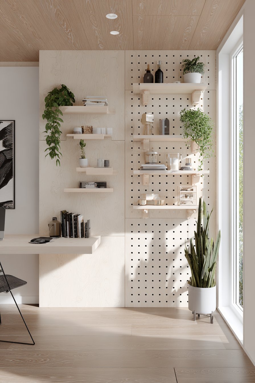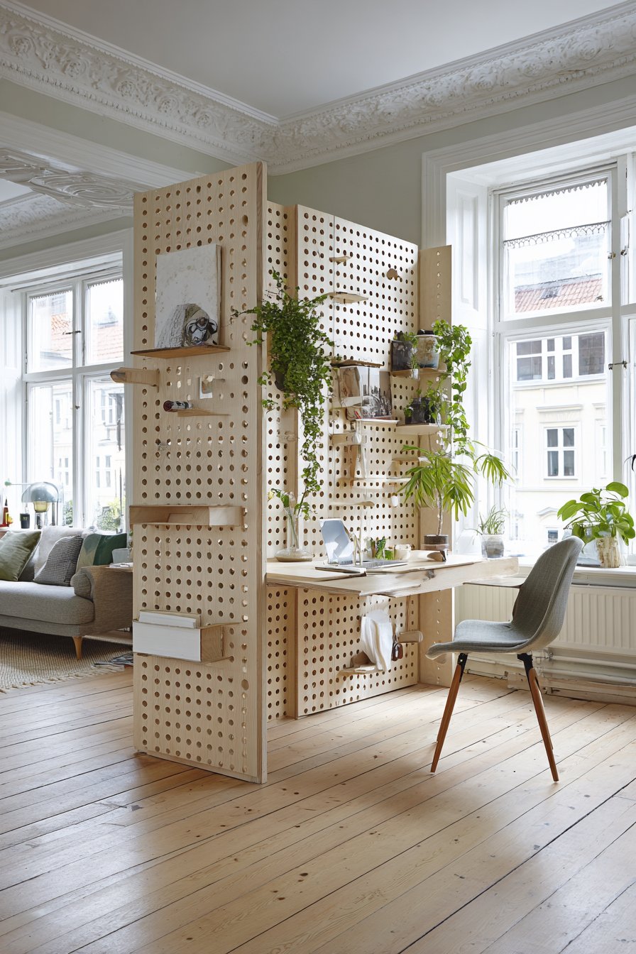 Scandinavian design principles of functionality, simplicity, and adaptability find perfect expression in the pegboard wall partition system, a modular solution that combines room division with customizable display and storage. This design features natural birch plywood with its characteristic pale tone and subtle grain, perforated with a regular grid of holes that accept adjustable wooden pegs. The system displays hanging plants in macrame holders, small floating shelves supporting books and decorative objects, and framed artwork, all easily rearranged as needs or aesthetics change. The partition separates a workspace from the living area while providing organizational infrastructure that evolves with changing requirements. Natural lighting creates interesting shadow patterns through the perforated surface, adding visual dimension to the functional design.