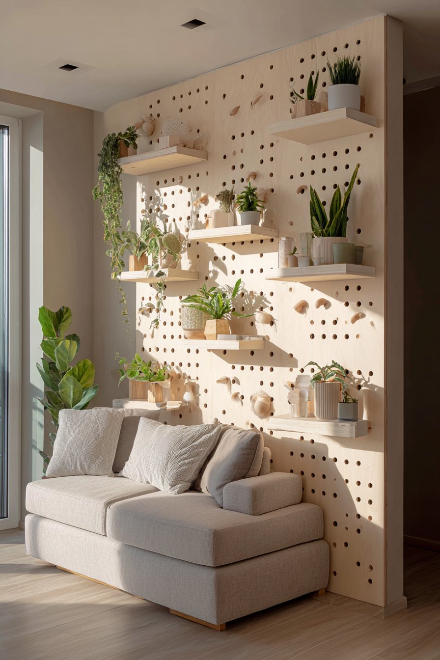 Key Design Tips: Choose high-quality birch plywood with smooth, finished surfaces for refined appearance. Ensure proper structural framing behind pegboard to support both the panel and items hung on it. Space holes according to standard pegboard patterns for accessory compatibility. Finish edges cleanly to prevent splinters and create polished appearance. Source a variety of peg types, lengths, and accessories to maximize organizational potential. Plan the partition size based on items you’ll display—too small and it can’t fulfill storage needs. Consider painting pegboard if you want color rather than natural wood—use paint that won’t clog holes. Arrange items with intentional negative space to prevent cluttered appearance. Rotate displays seasonally to keep the design fresh and engaging. Consider weight distribution when hanging heavier items—place these where framing provides best support. Use consistent peg colors or varied ones depending on desired aesthetic. Plan lighting to minimize shadows that could make finding specific pegs difficult. Consider the partition’s depth including items that protrude—ensure adequate clearance from traffic patterns.
