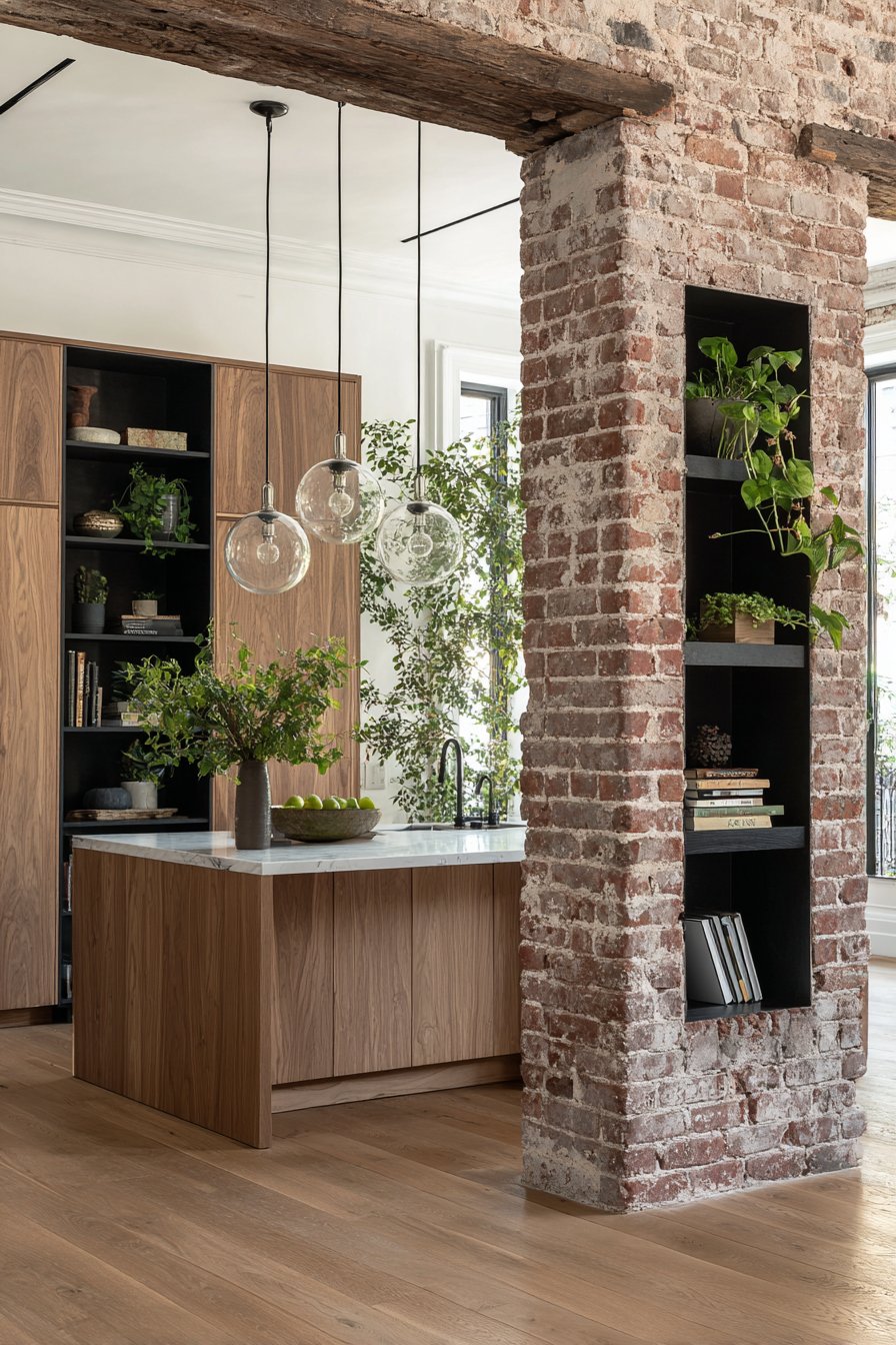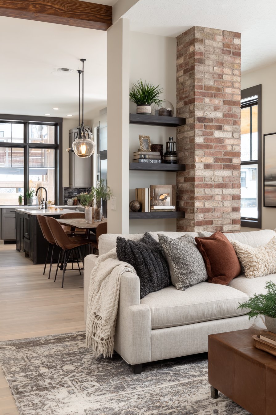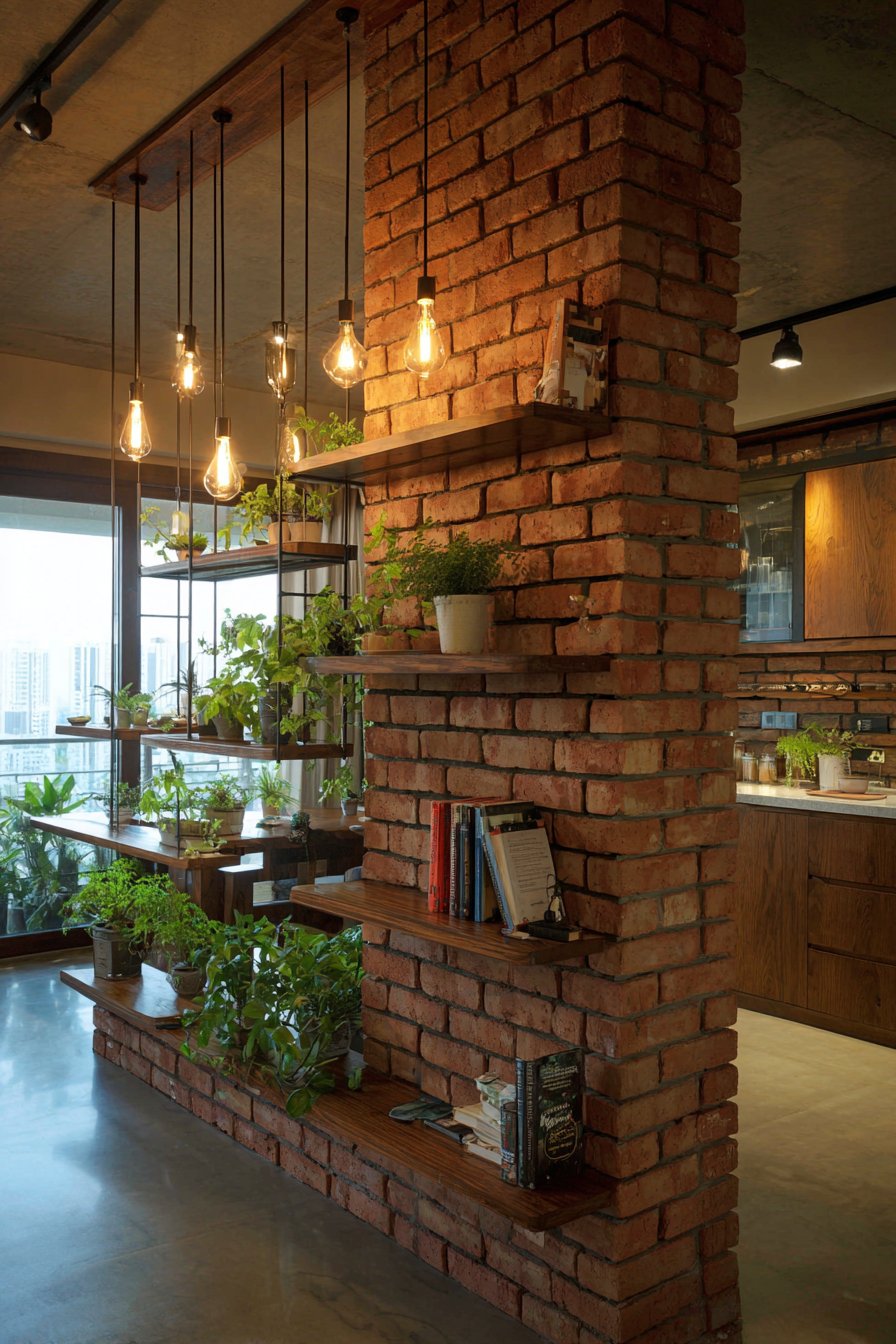 Key Design Tips: Decide between real brick and brick veneer based on structural requirements and budget—veneer is lighter and easier to install. Ensure proper structural support for brick or brick veneer weight. Choose mortar color carefully as it significantly affects final appearance—traditional grey, bright white, or matched to brick tones. Consider sealing brick to prevent dust shedding and ease cleaning, especially in kitchen areas. Plan shelf brackets that coordinate with industrial aesthetic—raw steel, black iron, or brass work well. Coordinate brick tones with your overall color palette—some bricks read very red, others more orange or brown. Consider mixing new and reclaimed bricks for varied appearance. Plan adequate structural support for floating shelves, especially if displaying heavy items. Ensure pendant lights are positioned to illuminate both sides of the partition. Consider the permanent nature of brick installation. Clean brick periodically to remove dust and grease accumulation. Plan for how utility lines will run through or around the partition. Consider acoustic implications—brick provides some sound dampening between zones.