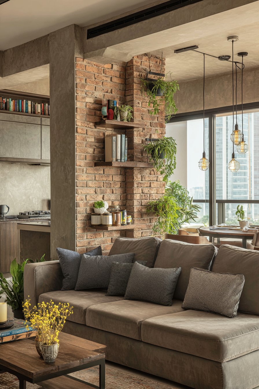 Industrial loft aesthetics find authentic expression in the brick veneer column partition, an architectural element that brings raw urban character into residential interiors. This design features exposed red clay bricks arranged in traditional running bond pattern, their warm terracotta tones and slightly irregular surfaces creating textural richness and authentic masonry appearance. The partial wall with open sides separates kitchen from living area while maintaining crucial visual connection between zones, preventing either space from feeling isolated. Built-in floating shelves on both sides—crafted from reclaimed wood or raw steel—display plants and books while adding functional storage. Edison bulb pendant lights hanging nearby enhance the industrial aesthetic while providing practical task lighting.