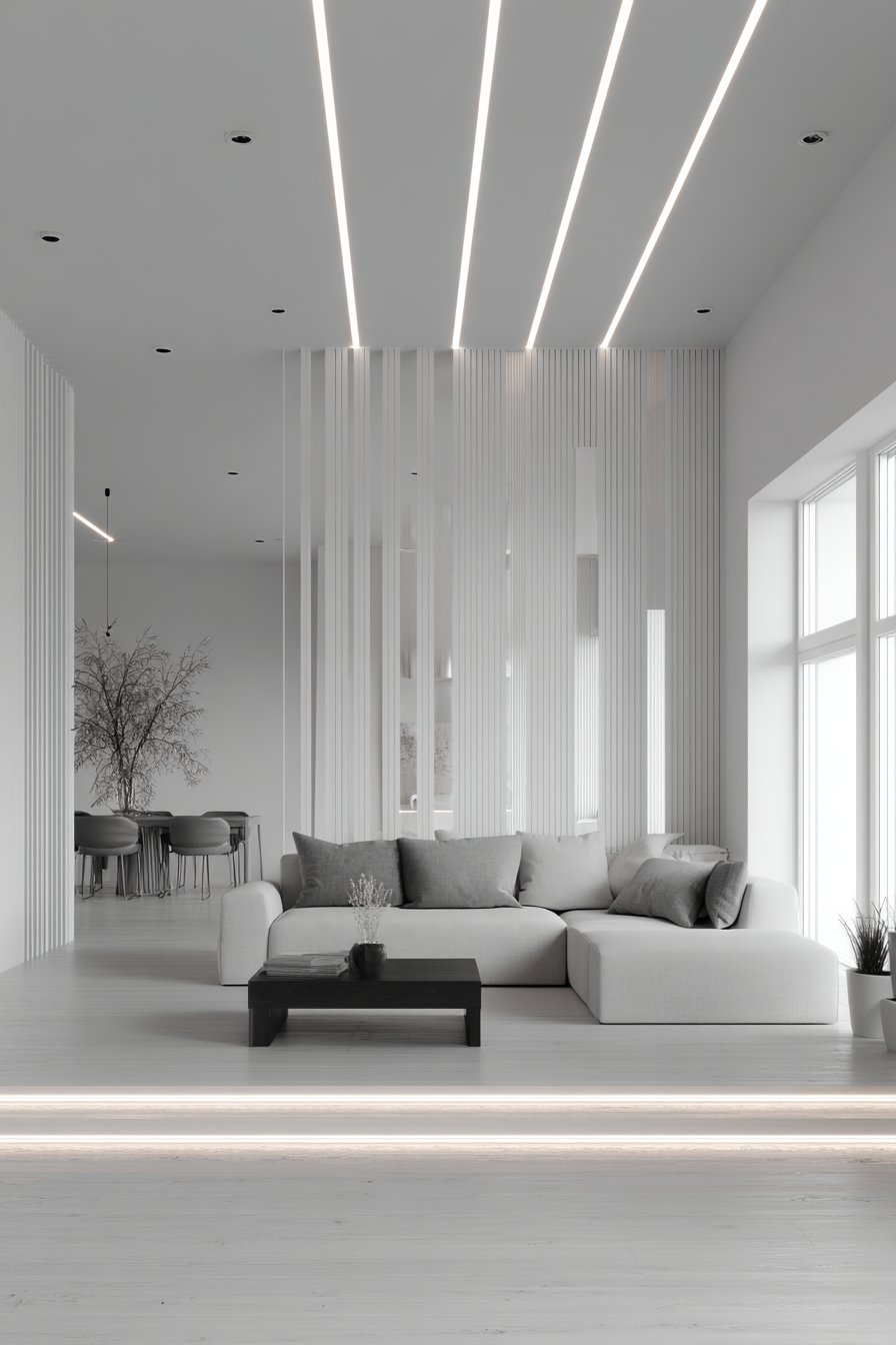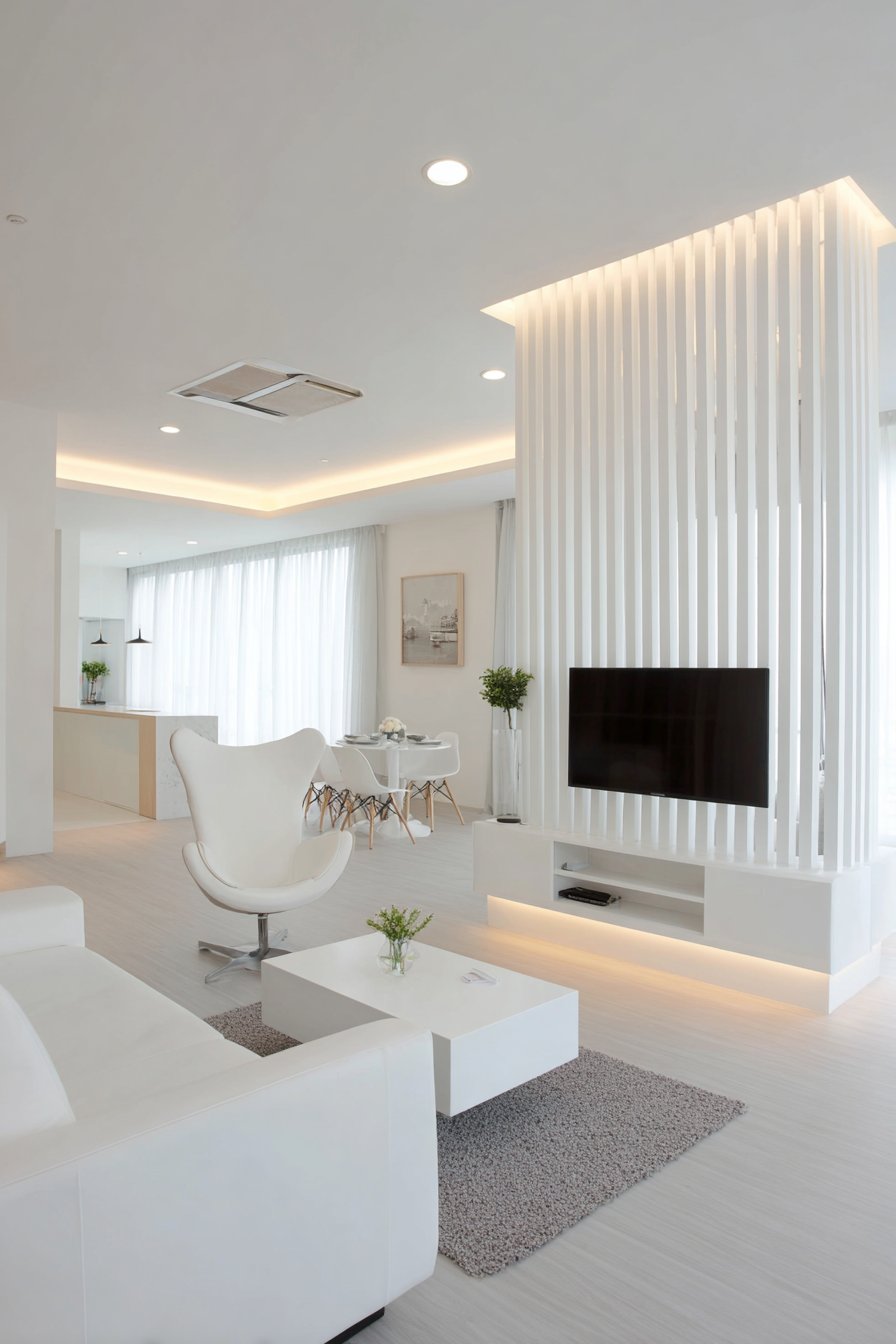 Sophisticated simplicity defines the minimalist white panel partition with clean vertical grooves, a design that proves restraint can be as impactful as elaboration. This floor-to-ceiling installation features white painted MDF with subtle texture created through regularly spaced vertical grooves that add dimensional interest without pattern complexity. The partition separates entryway from living area with refined elegance, its pristine surface and architectural presence creating sophisticated first impressions. Integrated LED strip lighting positioned within the grooves provides soft ambient glow that transforms evening atmosphere while highlighting the textural details. Light grey flooring and white walls maintain cohesive minimal aesthetic, the monochromatic palette creating serene, gallery-like spaces.
