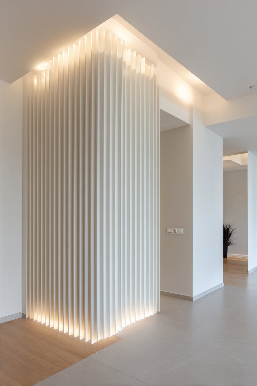 The vertical groove pattern serves multiple design functions simultaneously. The vertical lines draw the eye upward, emphasizing ceiling height and creating a sense of grandeur despite the partition’s clean simplicity. The grooves create subtle shadow lines that change throughout the day as natural light angles shift, adding organic variation to surfaces that might otherwise read as flat. The narrow LED strips integrate so seamlessly that light appears to emanate from the grooves themselves rather than from visible fixtures, creating an almost magical floating-light effect. The white color maximizes light reflection, crucial for maintaining brightness in entryways that often lack direct window access.