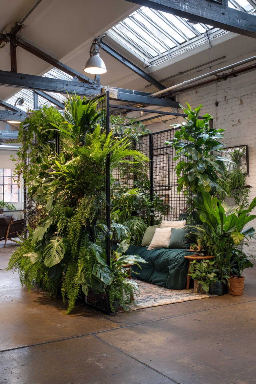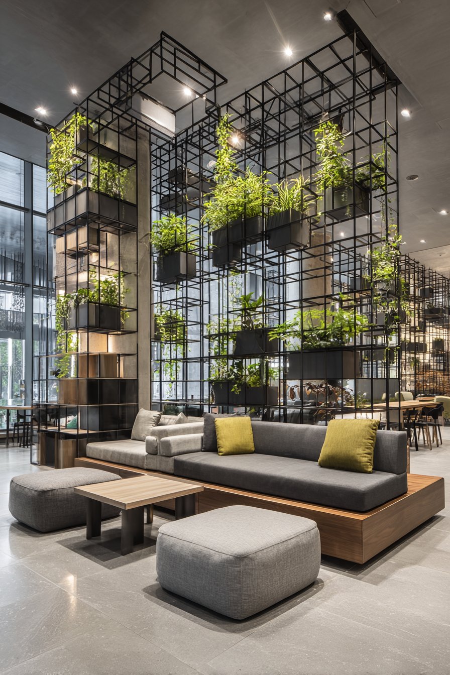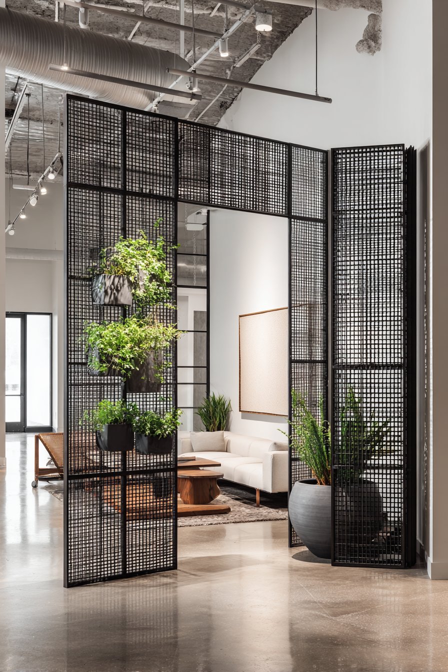 This partition style requires more maintenance than passive dividers but rewards that investment with continuously evolving beauty. Plants grow and change with seasons, creating a dynamic rather than static design element. The modular planter system allows for easy plant replacement if specimens falter or when you desire different varieties. Soft natural lighting from skylights or windows positioned to illuminate the living wall ensures healthy plant growth while creating dappled light patterns reminiscent of forest floors. The black metal grid framework provides necessary structural support while visually receding, allowing the plants to take center stage. The integration of biophilic elements addresses the increasingly recognized human need for nature connection, particularly crucial in urban environments where access to green spaces may be limited.