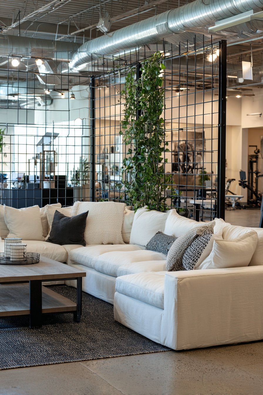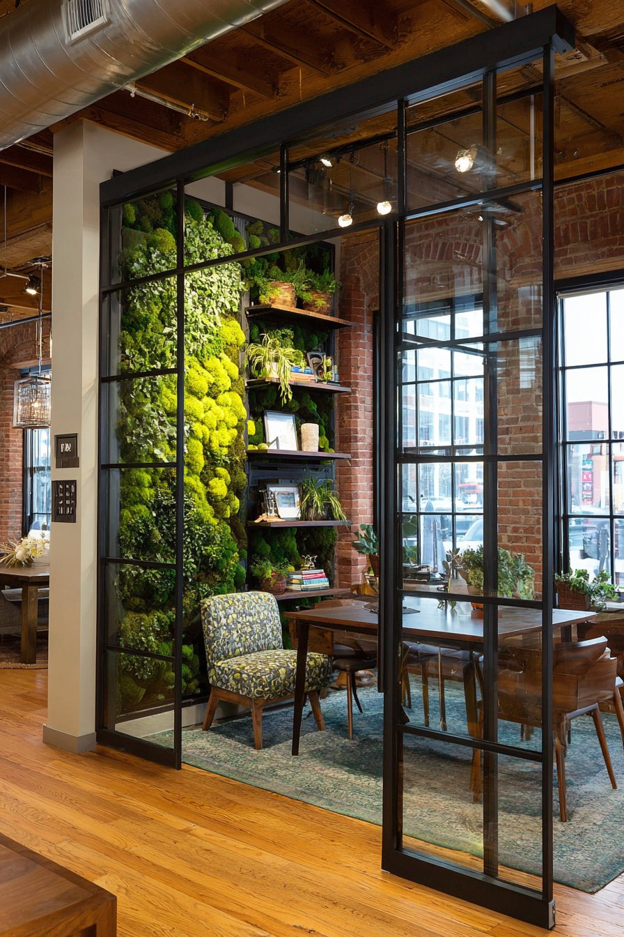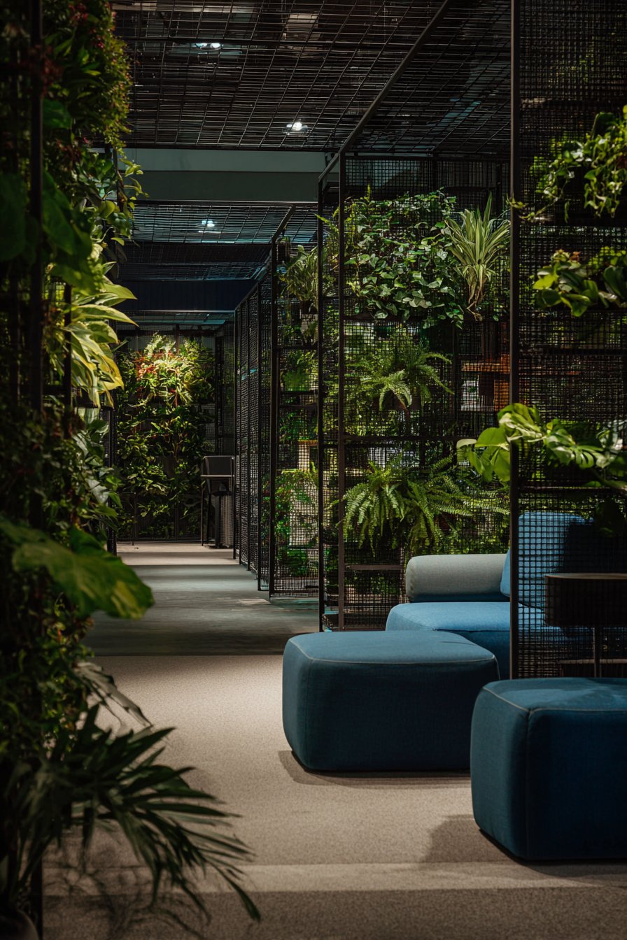 This partition style requires more maintenance than passive dividers but rewards that investment with continuously evolving beauty. Plants grow and change with seasons, creating a dynamic rather than static design element. The modular planter system allows for easy plant replacement if specimens falter or when you desire different varieties. Soft natural lighting from skylights or windows positioned to illuminate the living wall ensures healthy plant growth while creating dappled light patterns reminiscent of forest floors. The black metal grid framework provides necessary structural support while visually receding, allowing the plants to take center stage. The integration of biophilic elements addresses the increasingly recognized human need for nature connection, particularly crucial in urban environments where access to green spaces may be limited.