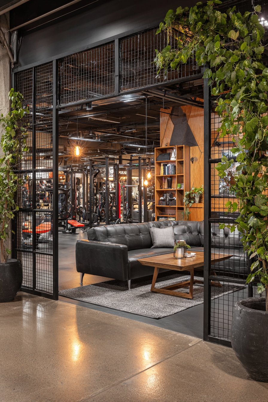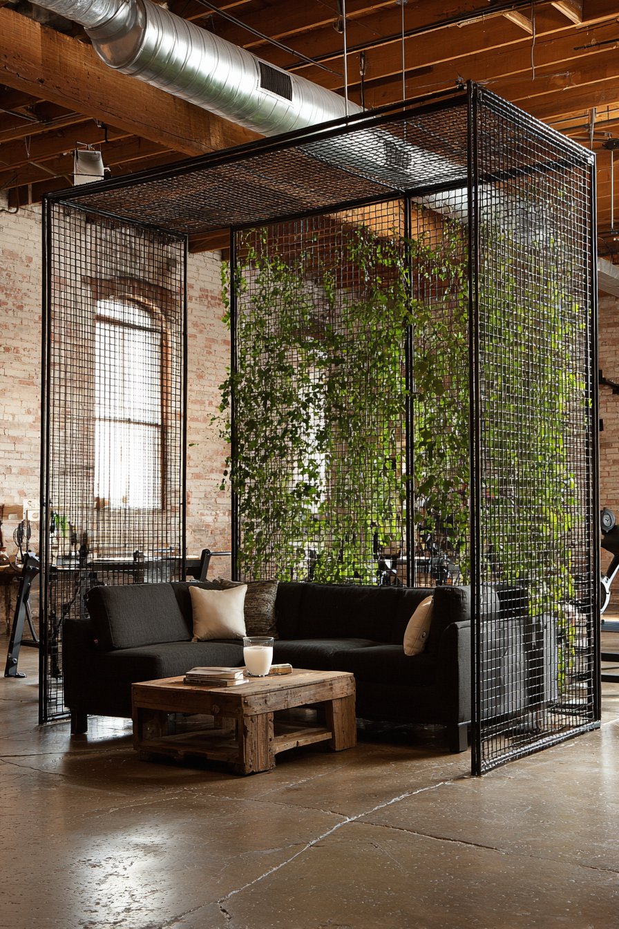 Raw, edgy aesthetic reaches full expression in the wire mesh partition with black powder-coated steel grid, a design element that celebrates industrial materials while creating semi-transparent room division. This partition separates living area from home gym space, its utilitarian character perfectly suited to fitness zone aesthetics while maintaining visual connection between spaces. The open grid design maintains excellent airflow and light penetration, crucial for gym areas that can become stuffy during workouts. Climbing plants grow up the mesh surface, their verdant foliage softening the hard industrial edges and introducing biophilic elements that make the gym space more inviting. Concrete flooring and exposed ductwork complement the utilitarian aesthetic, creating cohesive industrial design narratives.