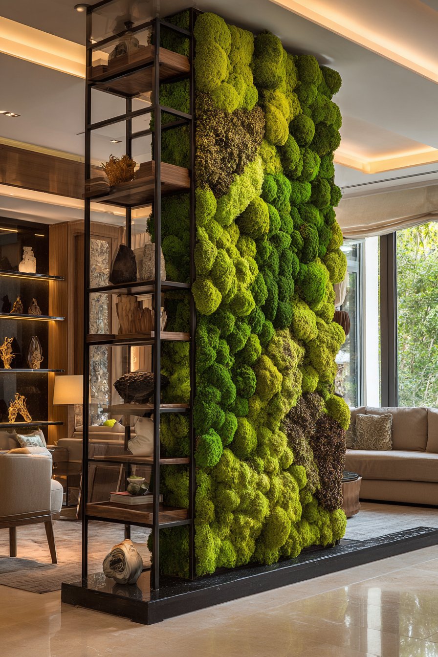 This partition style suits wellness-focused individuals, those with strong environmental values, or anyone seeking to bring nature indoors in dramatic fashion. The preserved moss requires no watering, soil, or typical plant maintenance, making it practical for those wanting natural aesthetics without gardening commitment. The black metal framing provides structural support while creating strong graphic lines that prevent the organic moss from appearing too casual or rustic. The substantial presence of a full moss wall creates focal points and conversation pieces, transforming ordinary room division into distinctive design features. The investment in quality moss installation pays dividends in uniqueness, wellness benefits, and enduring natural beauty.