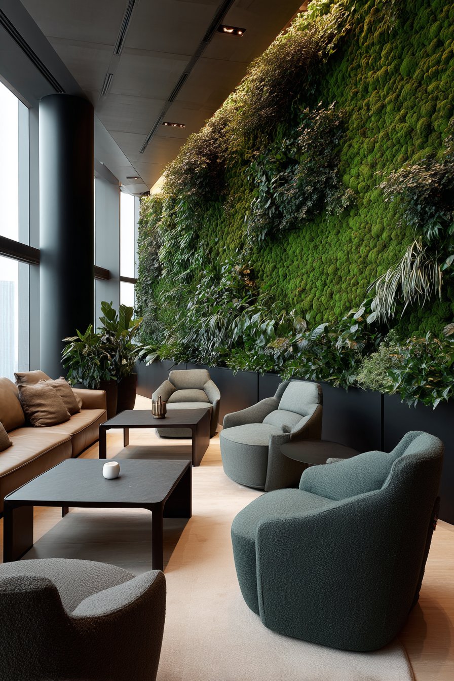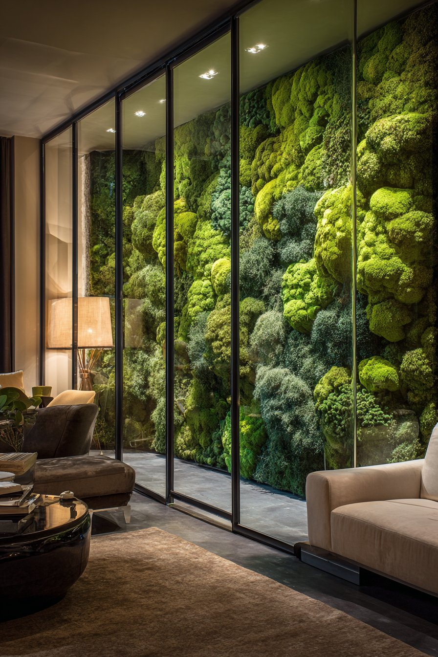 Biophilic design reaches its most dramatic expression in the living moss wall partition, an installation that brings forest-floor beauty into interior environments while providing wellness benefits beyond aesthetics. This design features preserved moss in varied green tones—from deep forest hues to bright lime shades—creating textured organic surface within black metal framing. The three-dimensional moss surface provides natural acoustic dampening benefits, absorbing sound that would otherwise reflect off hard surfaces. The maintenance-free botanical installation separates formal sitting area from casual family room, creating zones with distinct characters while introducing natural elements throughout. Integrated grow lights maintain the preserved moss’s appearance, ensuring consistent color and texture over time.