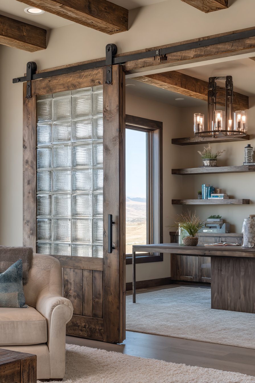 The fusion of rustic farmhouse aesthetics with modern functionality finds perfect expression in sliding barn-style partition doors featuring frosted glass panels. This partition design offers unparalleled flexibility, allowing spaces to open completely for social gatherings or close for privacy during work hours or quiet activities. The exposed black metal track system mounted to the ceiling or beam above serves as both functional hardware and design feature, its industrial character creating appealing contrast with the softer, translucent glass panels. Behind the partition, a compact home workspace benefits from the option of visual privacy during video calls or focused work sessions, while the main living area maintains its open, airy feel when the doors slide completely aside.