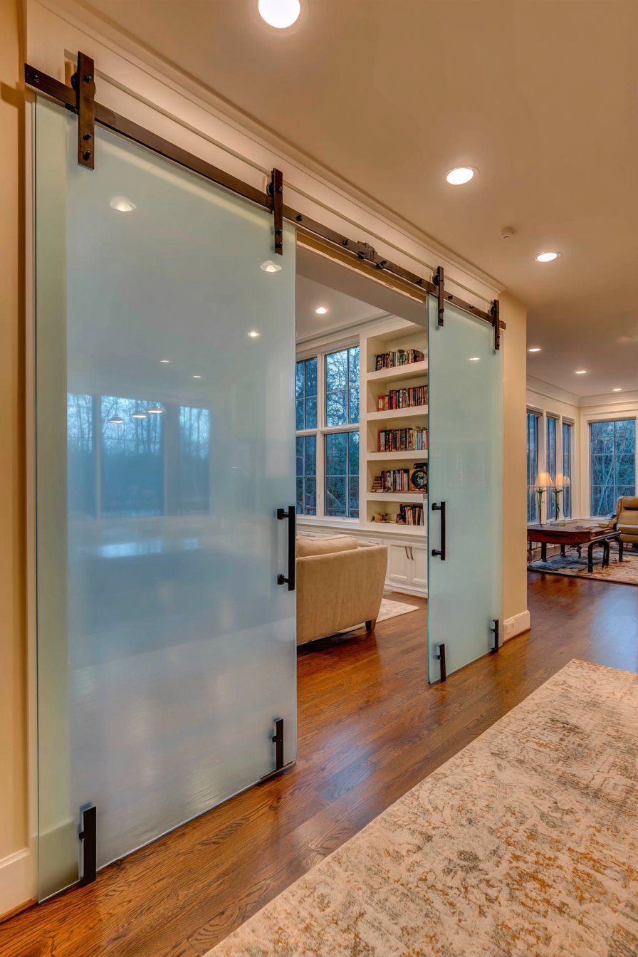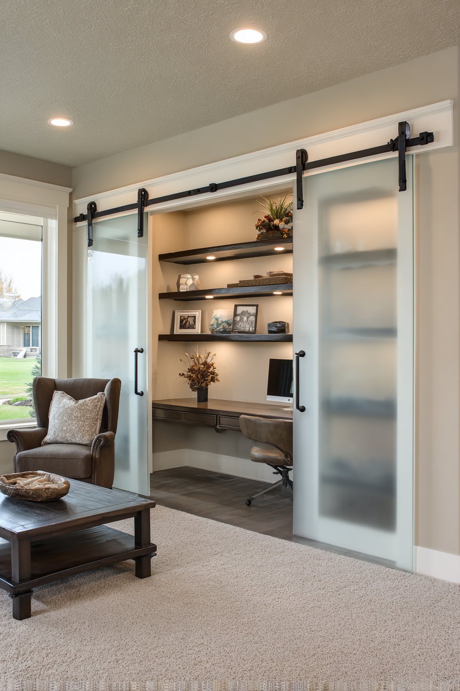 This partition style particularly appeals to those who appreciate the modern farmhouse aesthetic, where rustic elements like barn door hardware coexist harmoniously with contemporary materials like glass and metal. The design works equally well in urban lofts, suburban homes, and even traditional spaces seeking a touch of modern functionality. The contrast between the heavy-looking metal hardware and the delicate appearance of frosted glass creates visual tension that keeps the design interesting. When doors are partially open, they create diagonal lines that add dynamic geometry to the space, breaking up the orthogonal nature of most interior architecture.