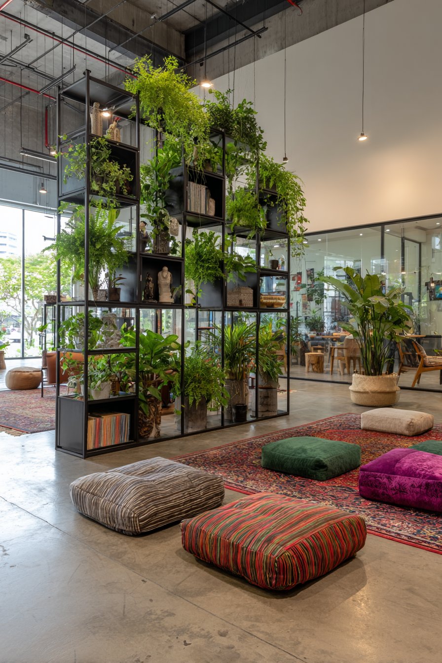 Biophilic design reaches its zenith in the living wall partition, a breathtaking integration of nature into interior architecture that serves both aesthetic and wellness functions. This vertical garden features lush tropical plants arranged in modular planters mounted to a black metal grid framework, creating a dense, green barrier that feels alive and organic. The plant selection includes cascading pothos with its heart-shaped leaves, delicate ferns that add textural softness, and robust philodendrons that provide fuller coverage, all thriving in a hydroponic system that ensures consistent moisture and nutrients. The verdant partition separates a meditation corner furnished with comfortable floor cushions from the main living area with its contemporary furniture, creating a serene sanctuary within the larger space.