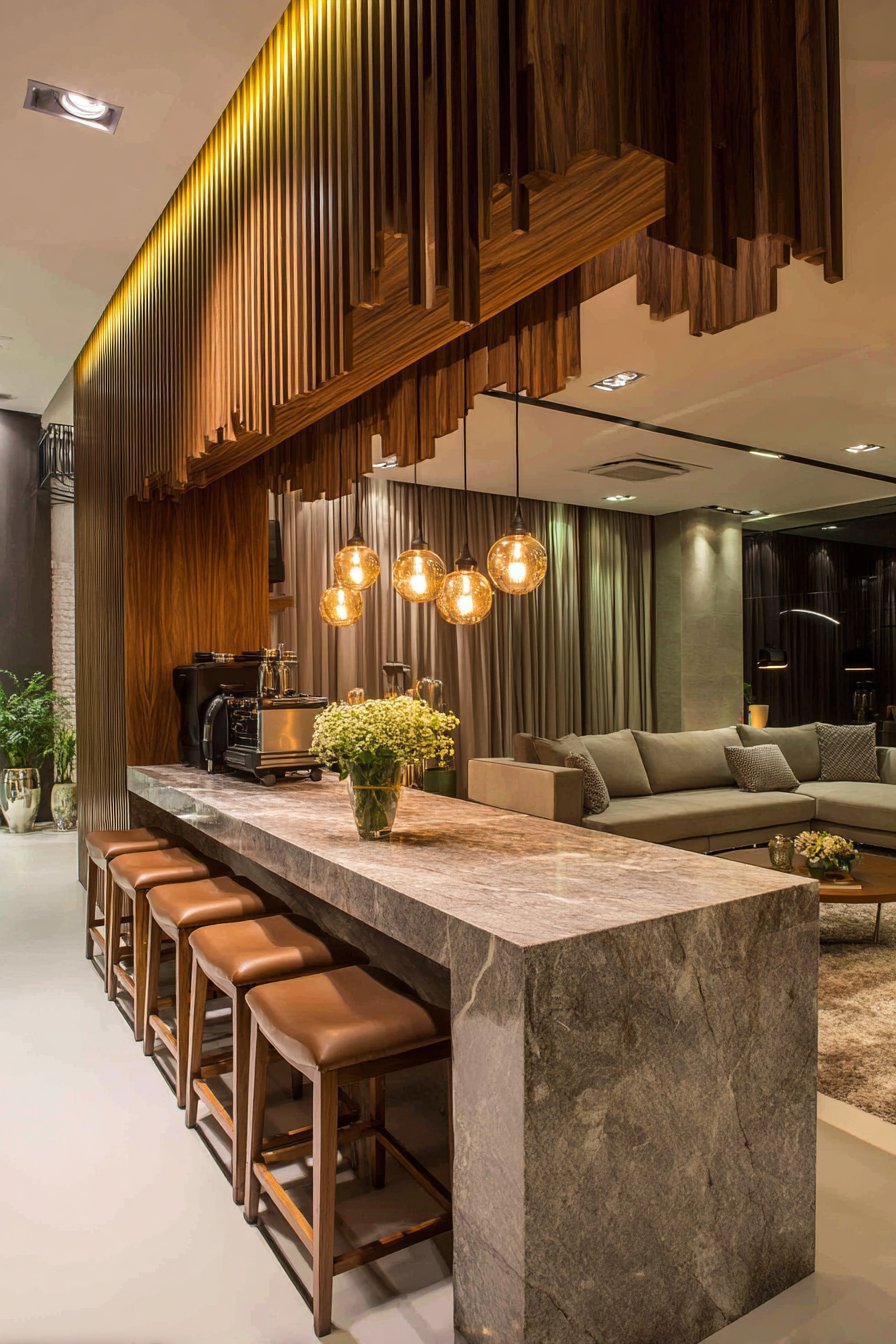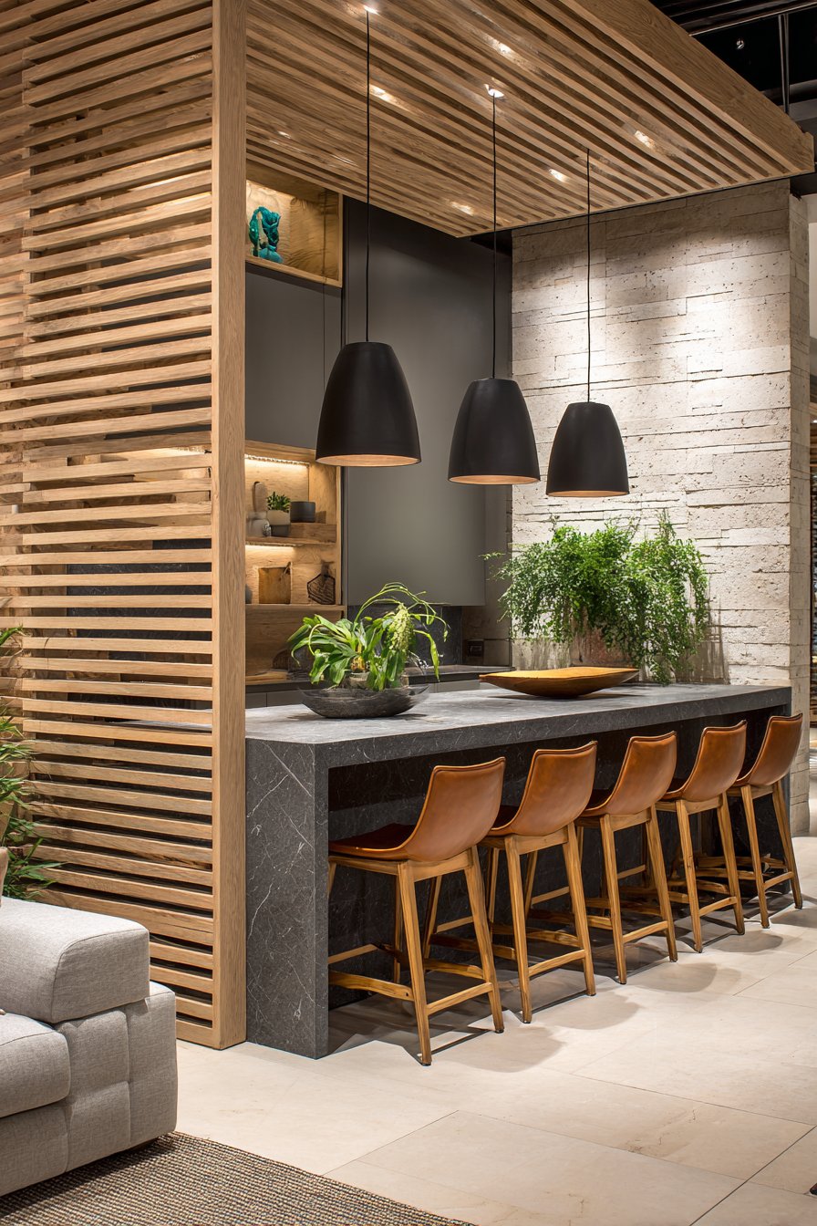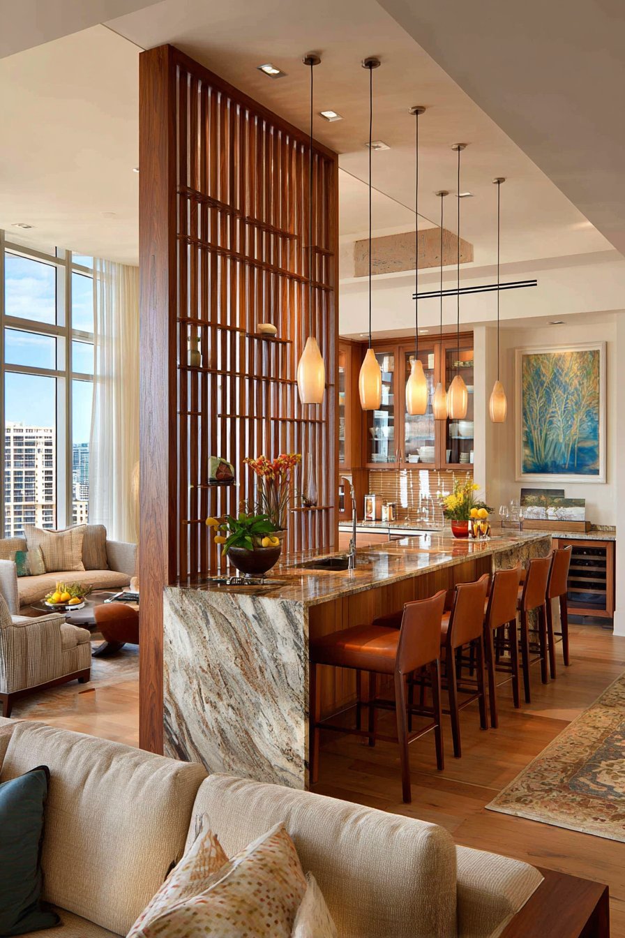 The half-wall partition represents a perfect middle ground between complete separation and total openness, offering definition without isolation. This design features horizontal wood slats in light ash finish, their pale tone and subtle grain creating contemporary warmth without overwhelming the space. The slats are topped with a sleek granite countertop surface that extends the partition’s functionality, transforming it into a serving counter or casual dining bar between the living room and kitchen areas. Bar stools with leather seats line the kitchen side, creating informal seating that encourages conversation between cooks and guests while maintaining distinct zones for food preparation and relaxation.