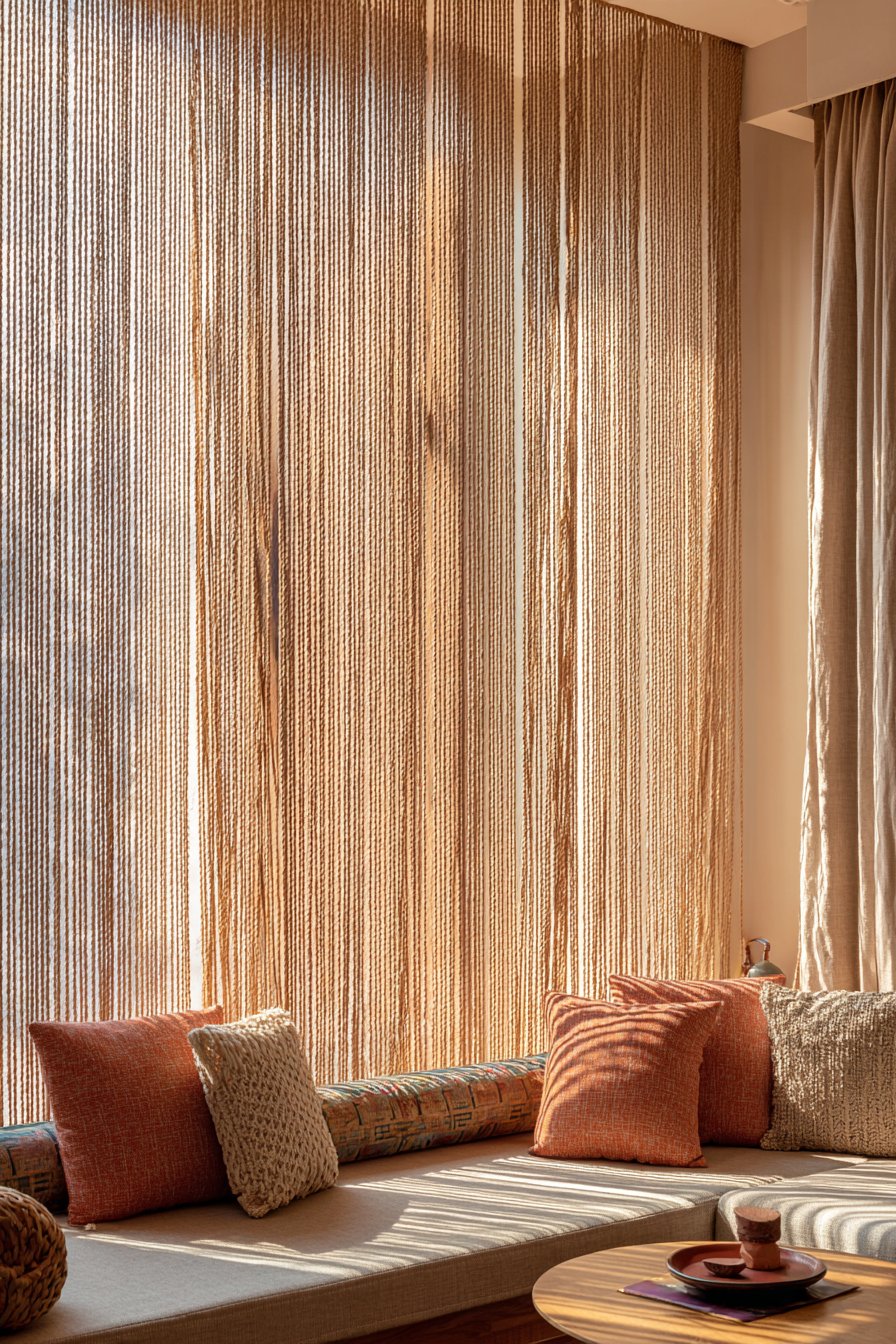 The choice of natural jute brings multiple advantages beyond aesthetics. The rope’s neutral, warm beige tone coordinates effortlessly with virtually any color palette, from crisp whites to deep jewel tones. The material’s texture absorbs and diffuses light rather than reflecting it harshly, creating soft ambiance throughout the day. Golden hour natural lighting transforms the ropes into glowing amber strands, casting gentle shadows that dance across floors and walls. The slight movement of ropes in response to air currents from HVAC systems or passing foot traffic adds subtle animation to the space, a quality impossible to achieve with rigid partitions.