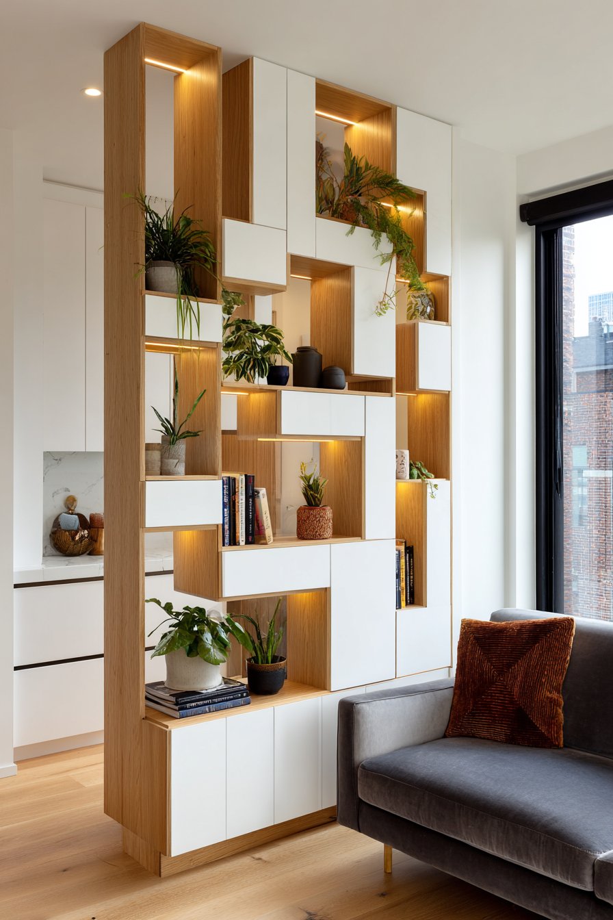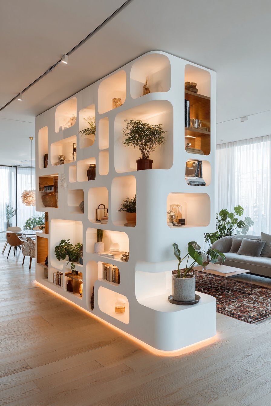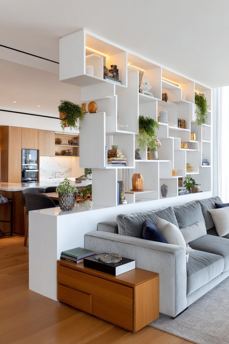 Modern design celebrates asymmetry and unexpected proportions, principles beautifully embodied in the custom-built shelving unit partition featuring irregular open compartments. This contemporary piece combines white lacquer and warm oak accents, creating a two-tone effect that adds visual interest while maintaining cohesion. The asymmetric arrangement of compartments—varying in size, shape, and orientation—creates a sculptural quality that transcends mere functionality, transforming the partition into an art piece that happens to hold objects. The design displays decorative items, books, and small plants while creating distinct zones for an entertainment center on one side and a reading nook on the other.