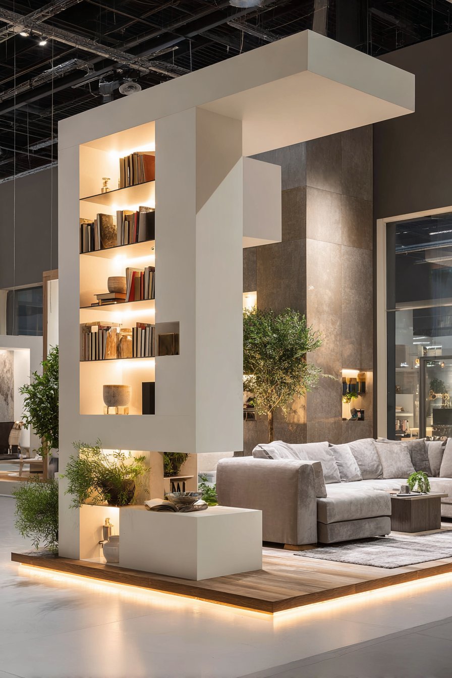 Key Design Tips: Ensure the unit is properly anchored to both floor and ceiling for stability given its height and weight when loaded. Space shelves at varying heights to accommodate different object sizes and create visual interest. Include a mix of open and closed storage options if you need to hide some items. Choose LED strips with adjustable color temperature to control ambiance. Arrange items with intentional negative space—avoid overcrowding shelves which can appear cluttered. Place heavier items on lower shelves for better weight distribution. Use cordless LED strips or carefully conceal wiring for a clean appearance. Consider the sight lines from both sides when arranging objects to ensure attractive views from all angles.