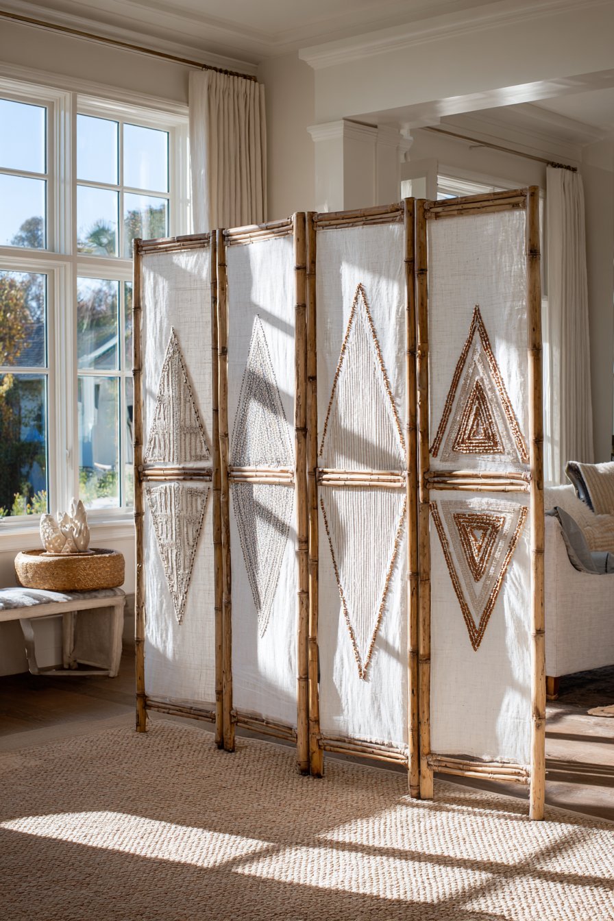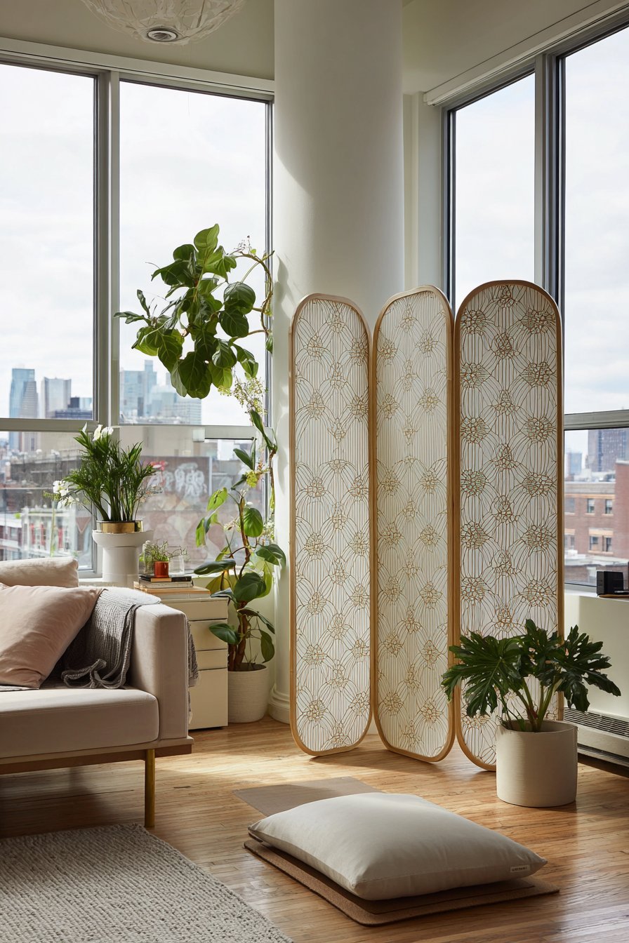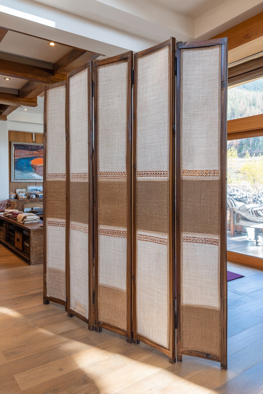 Flexibility reaches its peak with accordion-style folding screens, portable partitions that adapt to changing needs while contributing significant style to interiors. This design features fabric panels in neutral linen with geometric embroidery patterns, mounted within a natural bamboo frame that brings organic warmth and structural support. The portable nature of this partition makes it ideal for creating temporary zones—shown here partially extended to separate a yoga practice area from the main seating space, demonstrating how the same tool can serve meditation one moment and create intimate conversation areas the next. The textured fabric provides visual privacy while the folding mechanism allows complete removal when open-plan entertaining is desired.