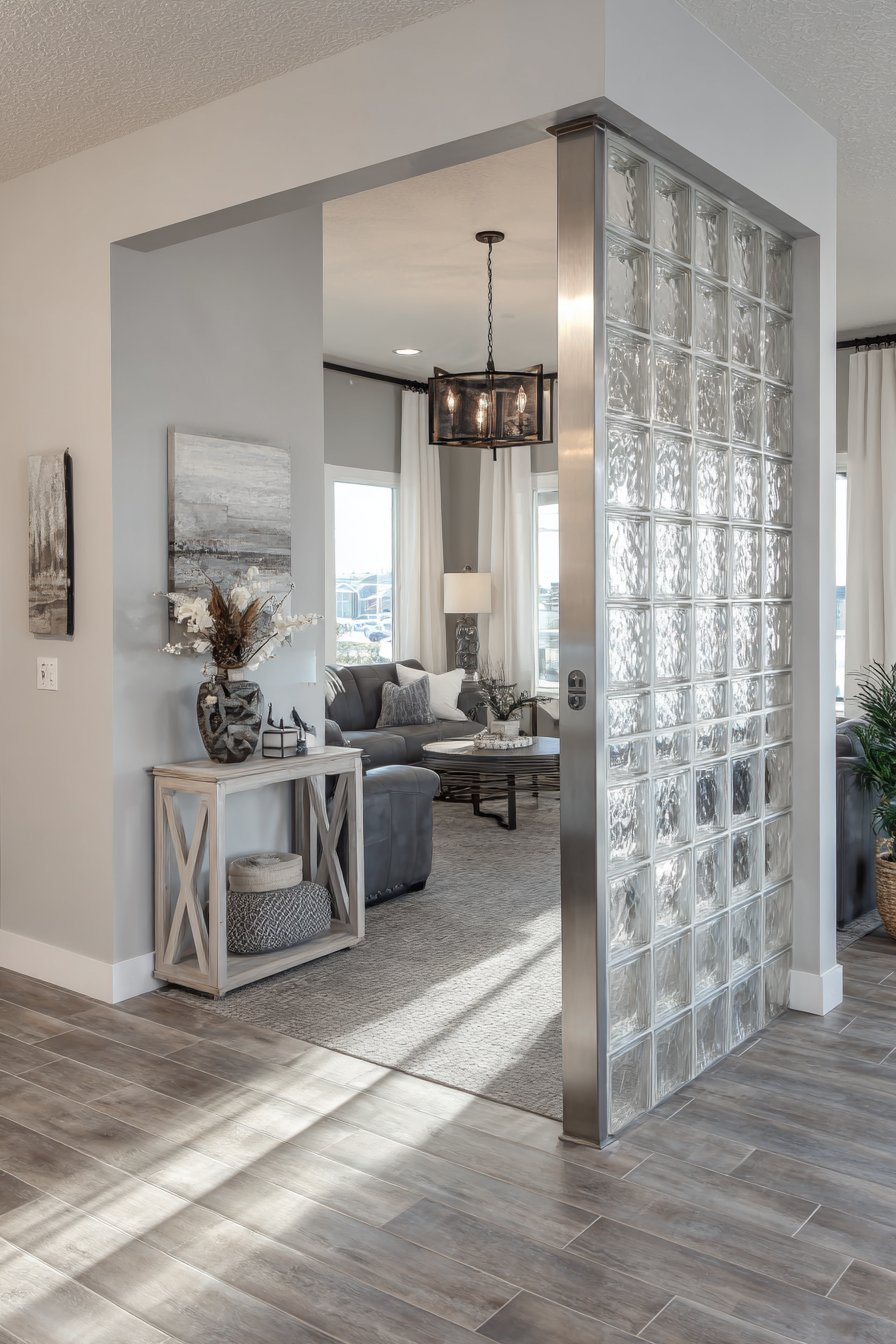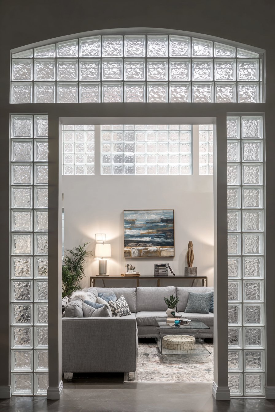 The glass block wall partition represents a fascinating marriage of mid-century modern sensibilities with contemporary minimalism, creating a architectural element with distinctive character. This design features translucent architectural glass bricks arranged in a precise grid pattern, their uniform spacing creating strong geometric rhythm while allowing natural light penetration throughout the space. Stainless steel framing provides structural support and adds industrial elegance, its reflective surface catching and scattering light in subtle ways. The substantial partition separates the main living area from the entryway, providing visual screening for guests arriving while maintaining the open feeling that characterizes contemporary design. A modern grey sofa arrangement faces away from the partition while a decorative console table positioned against it displays art and accessories.