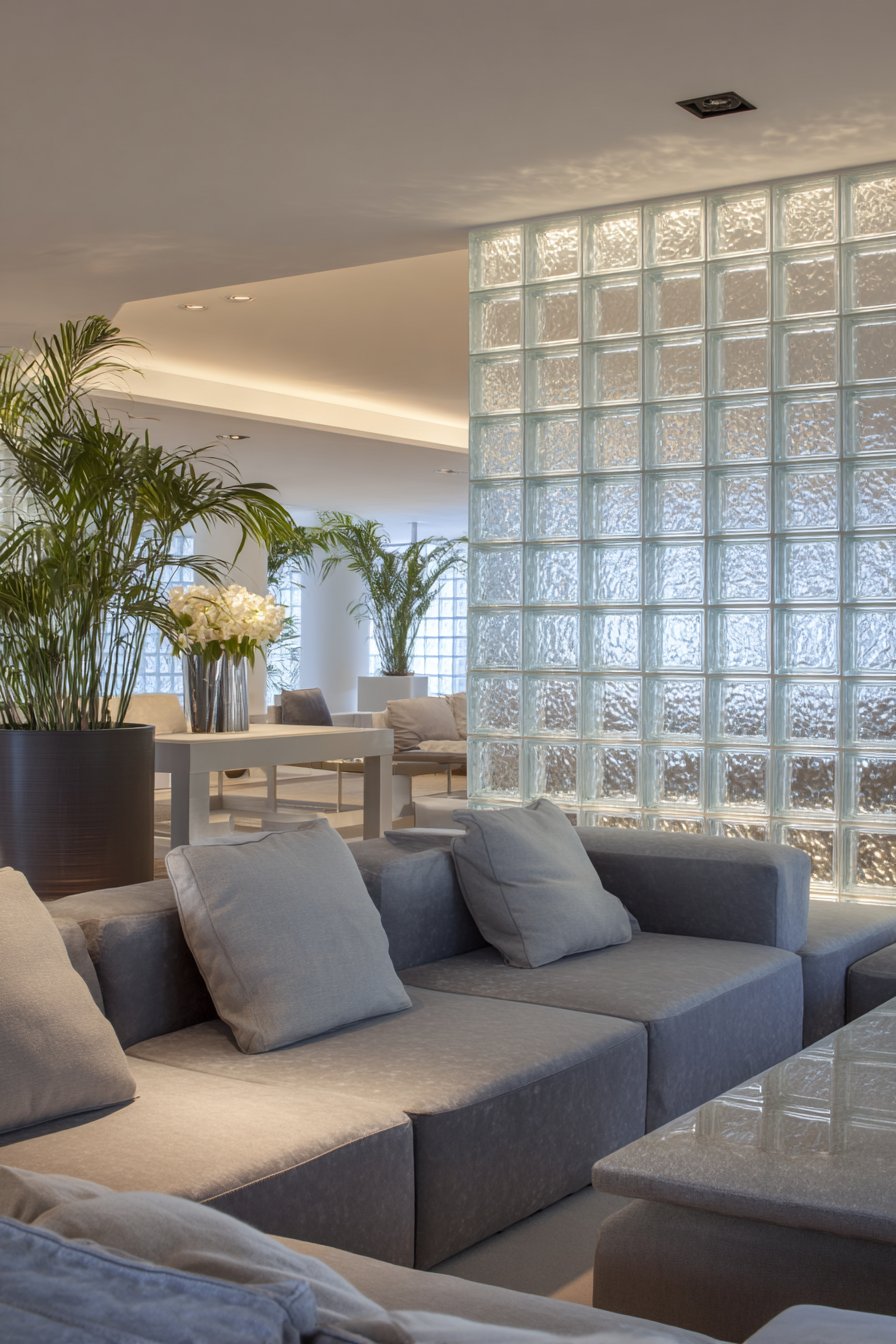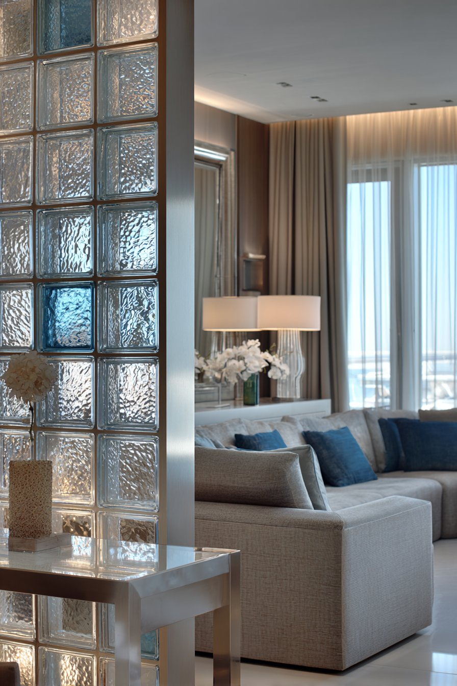 The translucent quality of glass blocks creates one of this partition’s most compelling features—the way it handles light. Unlike clear glass that provides unobstructed views, glass blocks diffuse and soften light, creating a gentle, filtered glow that feels peaceful and spa-like. The textured surface of each block—often featuring subtle patterns or bubbles within the glass—creates visual interest at close range while reading as a cohesive surface from distance. Natural light passing through creates subtle variations throughout the day as sun angles change, making the partition a dynamic element that responds to environmental conditions. The substantial thickness of glass blocks provides some acoustic dampening, muffling sound transmission between zones more effectively than thin glass panels.