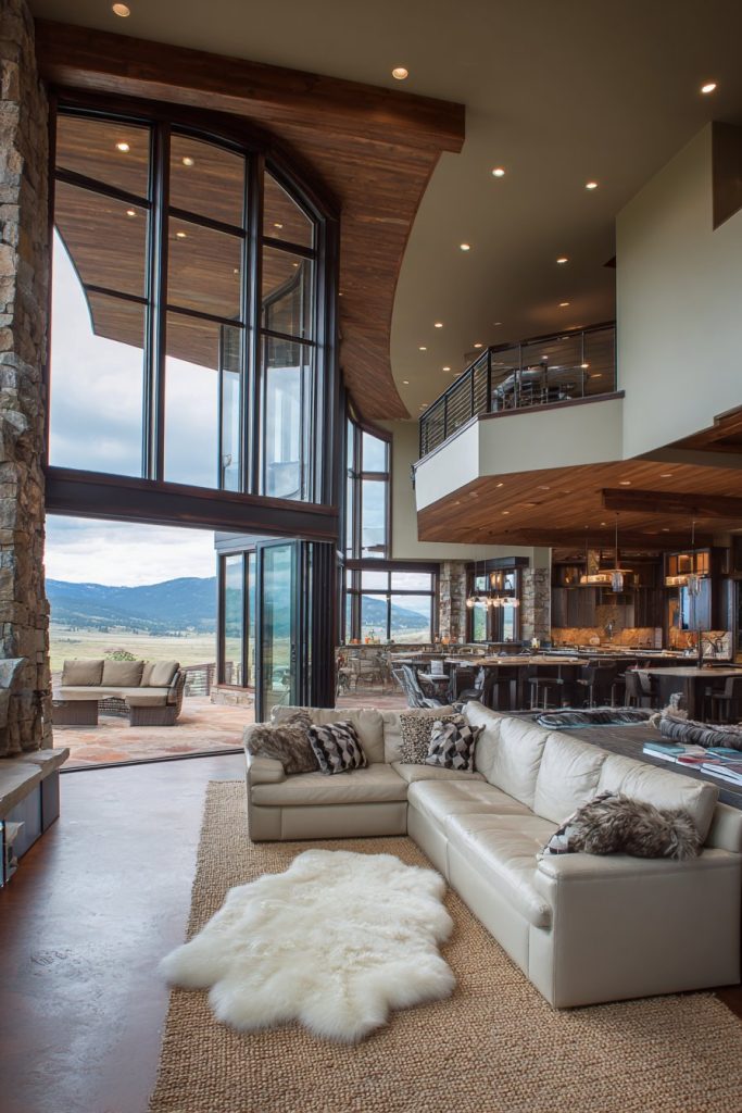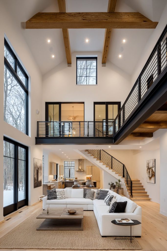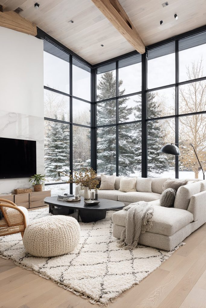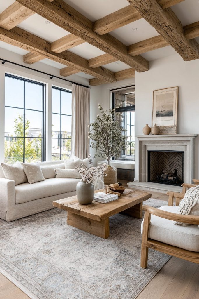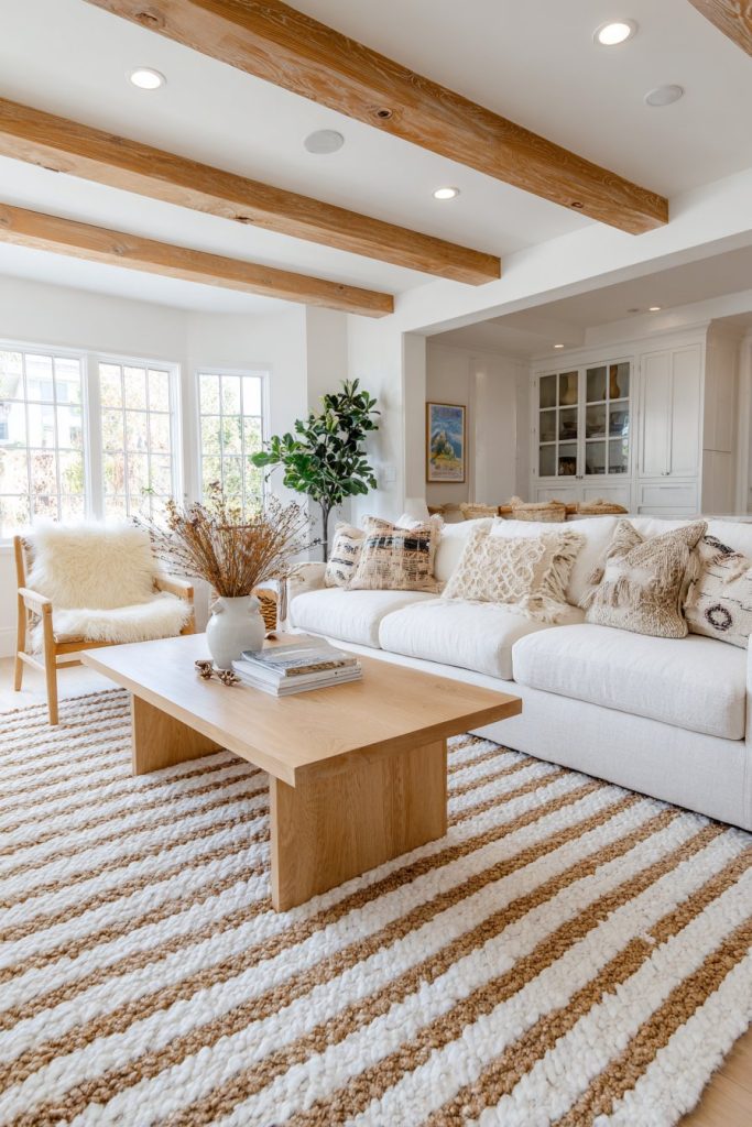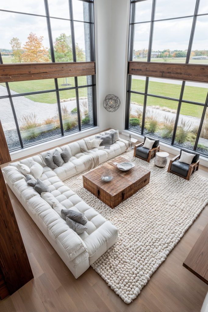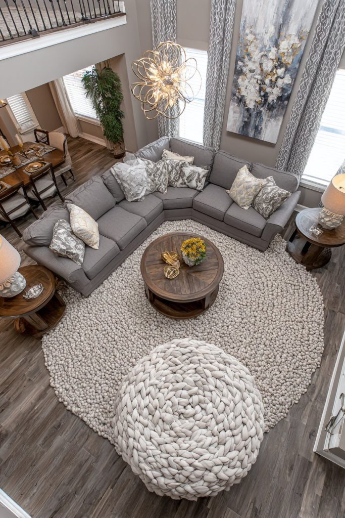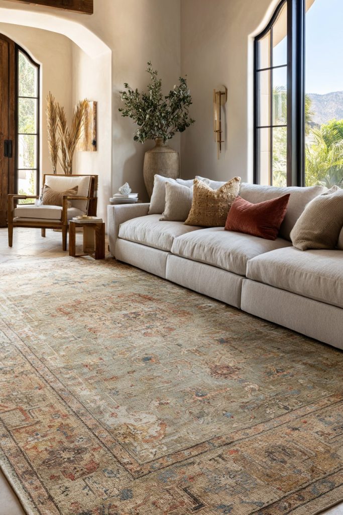 Master the challenge of open-concept living with a large neutral area rug that demonstrates how thoughtful space planning can create distinct functional zones while maintaining visual flow throughout connected living areas. This design approach solves one of modern home design’s greatest challenges—creating intimate spaces within expansive open floor plans.