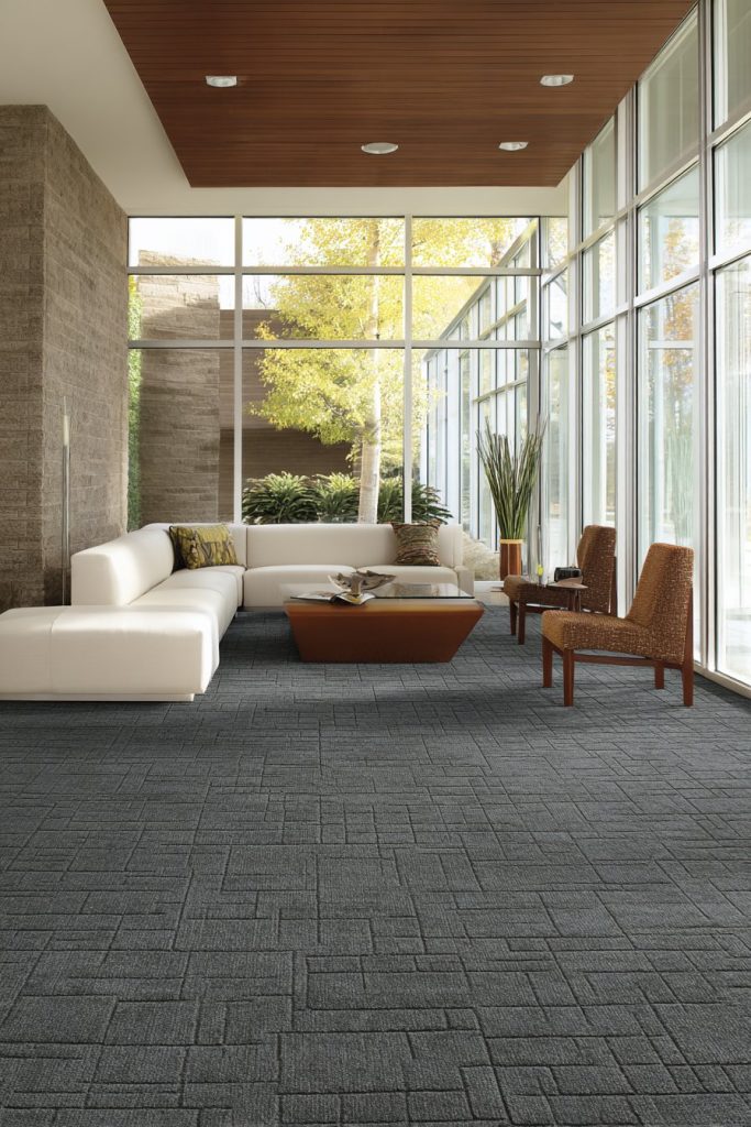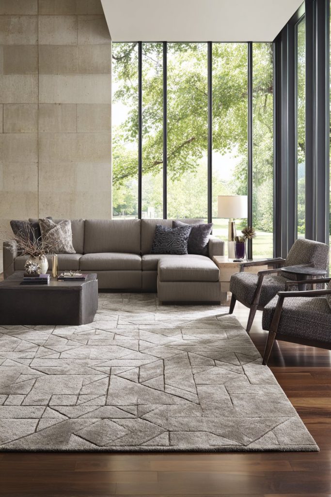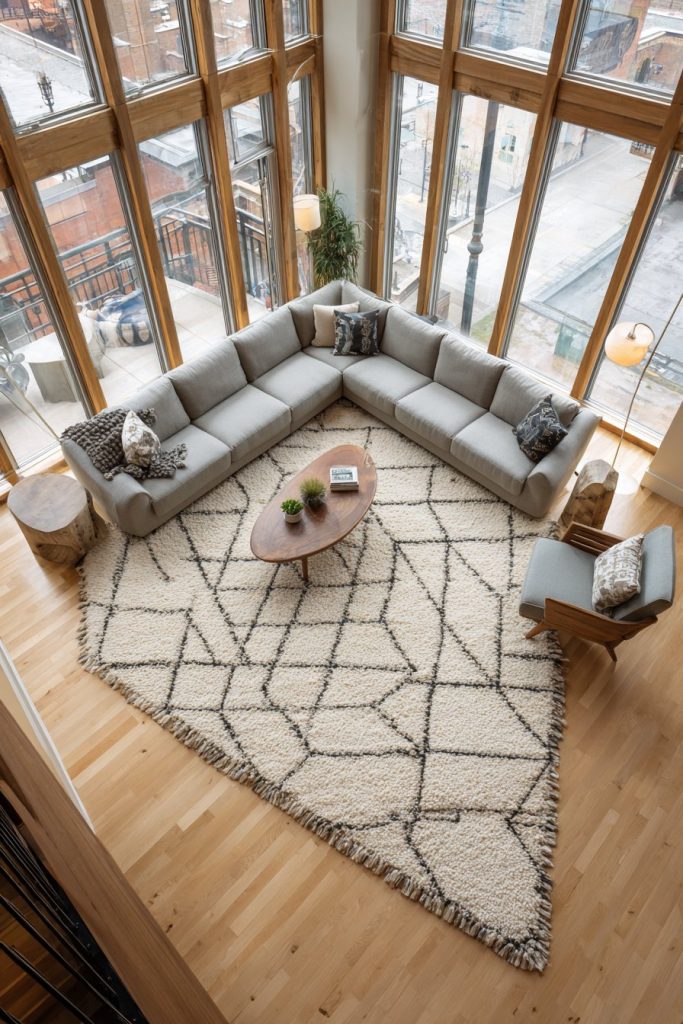 Floor-to-ceiling windows flood the space with natural daylight, which plays beautifully across the rug’s textural details and subtle pattern variations. This interplay of light and shadow enhances the geometric design throughout different times of day, creating an ever-changing visual experience that keeps the space feeling fresh and dynamic.
