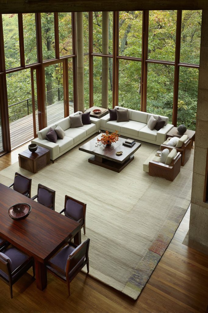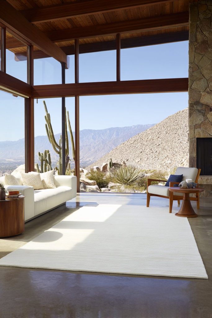Concrete floors and floor-to-ceiling windows provide architectural backdrop that emphasizes the home’s contemporary design while flooding the space with natural light. The contrast between the rug’s soft wool texture and the concrete’s hard industrial surface creates subtle visual tension that adds depth to the minimalist palette. Professional photography techniques capture the rug’s understated elegance and demonstrate how it grounds the modern furniture arrangement while maintaining the space’s sense of calm and order.