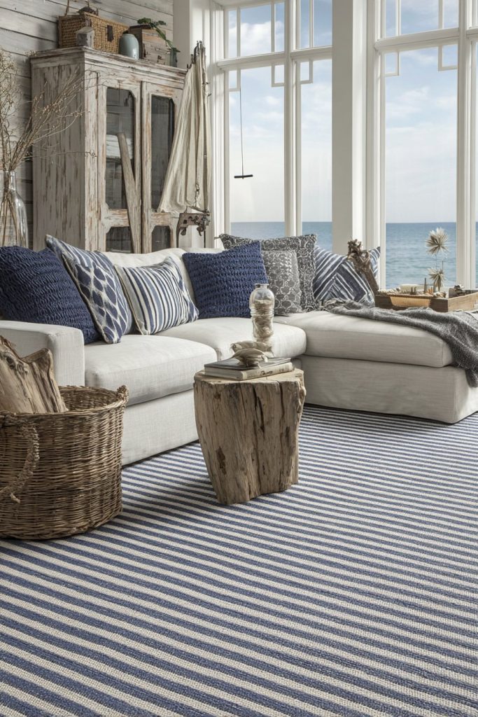 Bring the relaxed elegance of coastal living indoors with a natural fiber rug in weathered blue and white stripes that captures the essence of seaside style while maintaining sophisticated appeal for year-round enjoyment. This design approach demonstrates how coastal-inspired elements can create refreshing, comfortable living spaces that feel perpetually vacation-ready.