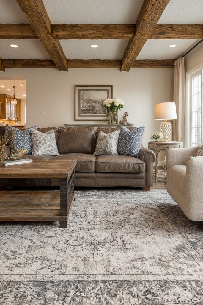Exposed ceiling beams and neutral color palettes enhance the rustic refinement while maintaining contemporary clean lines and uncluttered aesthetic. The careful balance between rustic elements—exposed beams, reclaimed wood, vintage patterns—and contemporary refinement—clean lines, neutral colors, quality upholstery—creates spaces that feel both historically grounded and thoroughly modern. Soft natural lighting emphasizes the rug’s weathered appearance and creates inviting shadows that highlight its authentic vintage character.