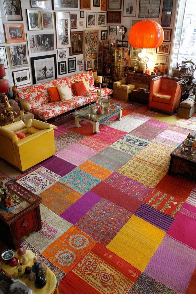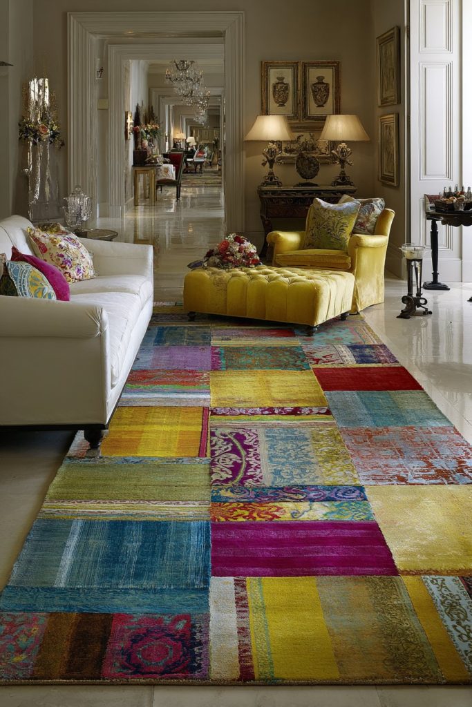 Celebrate individuality and creative expression with a colorful patchwork rug that demonstrates how eclectic design can successfully combine diverse elements into cohesive, personally meaningful living spaces. This bold design approach shows how confident pattern mixing and color coordination can create spaces that truly reflect their inhabitants’ personalities and collected experiences.
