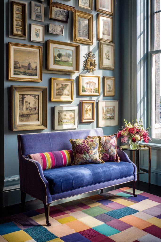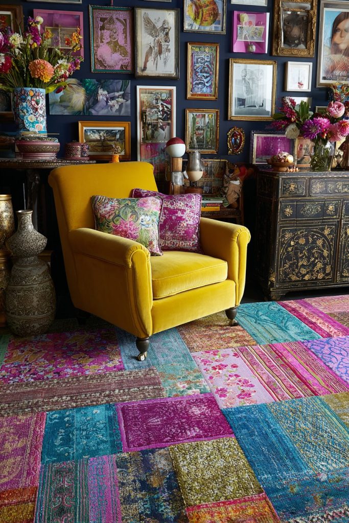 - Choose patchwork or mixed-pattern rugs for authentic eclectic foundation