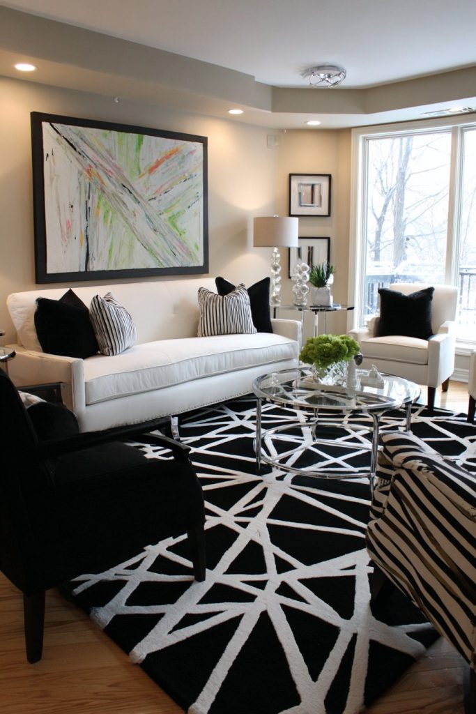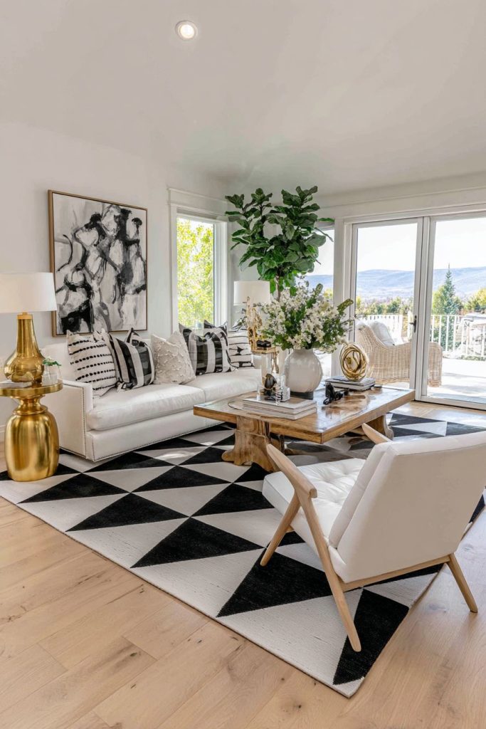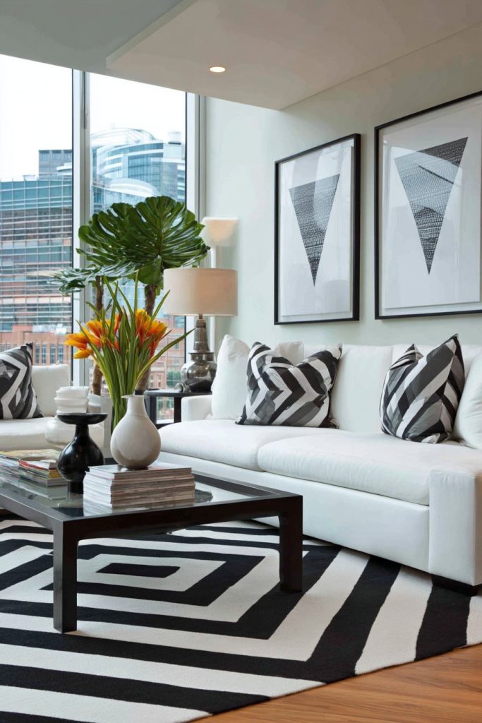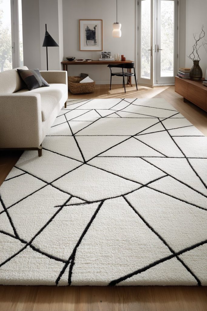 Create striking visual impact through confident use of black and white contrast with a geometric rug that demonstrates how monochromatic color schemes can produce sophisticated drama and contemporary elegance. This bold design approach shows how pattern and contrast can create visual excitement without relying on multiple colors.