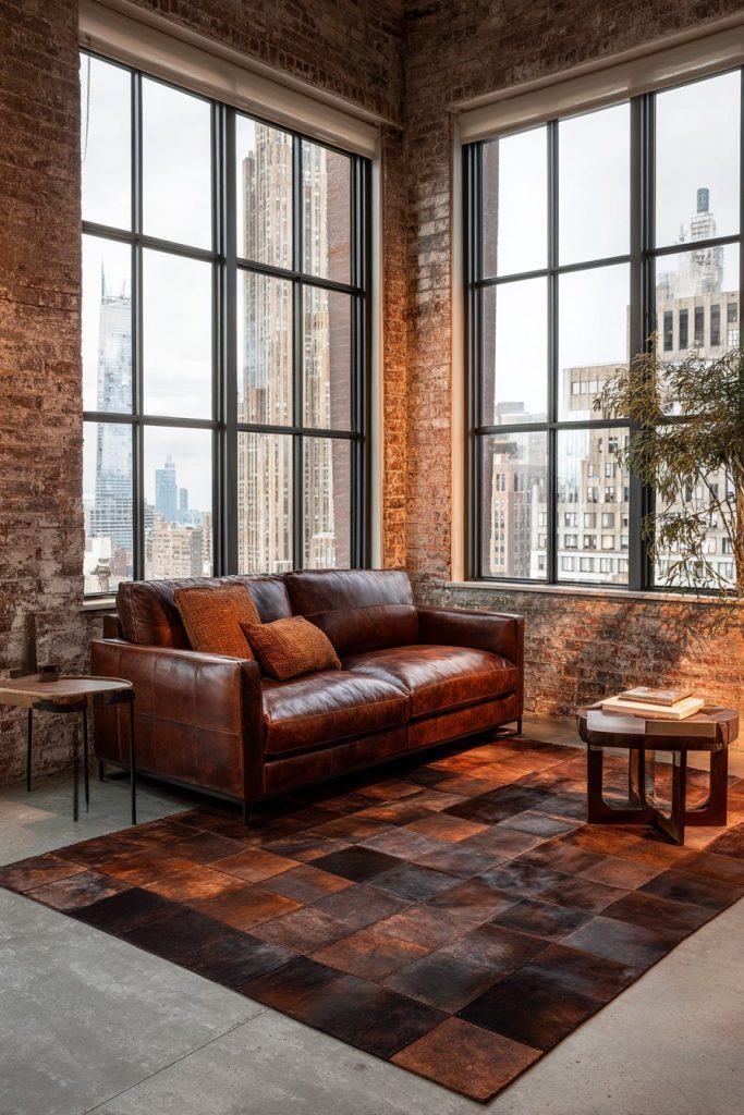 Concrete floors and large industrial windows provide authentic backdrop that enhances the rug’s rugged character while flooding the space with natural light that highlights the leather’s natural grain and aging patterns. The combination of industrial materials—concrete, metal, exposed brick—with the warm leather creates successful balance between urban edge and human comfort. Professional interior photography captures the rug’s rugged character and demonstrates how it successfully softens harsh industrial elements while maintaining authentic urban loft aesthetic.